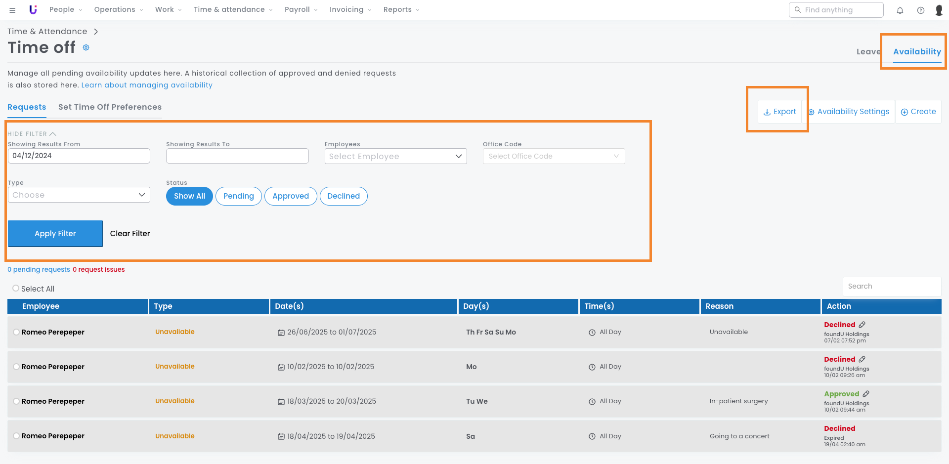 Hot tip: When you export an employee's ongoing availability, it reflects their current status. It does not account for any future changes or their availability at a later date. You can view an employee's future availability using the 'Leave and unavailability' display option from the roster.