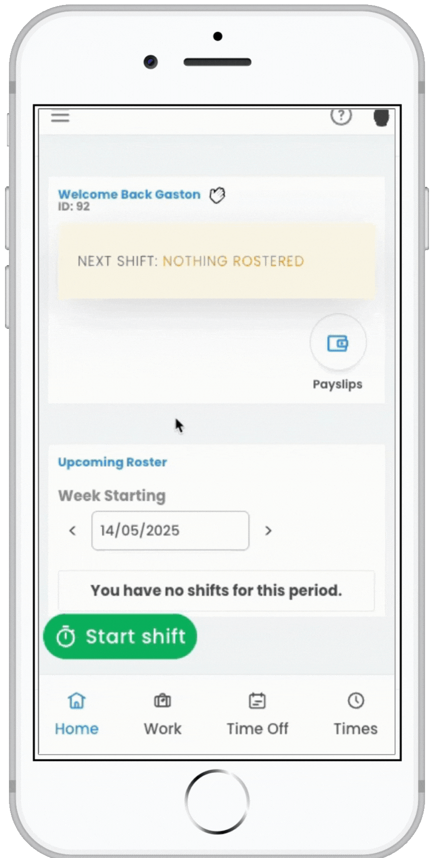- From the Home Page, select Start shift.