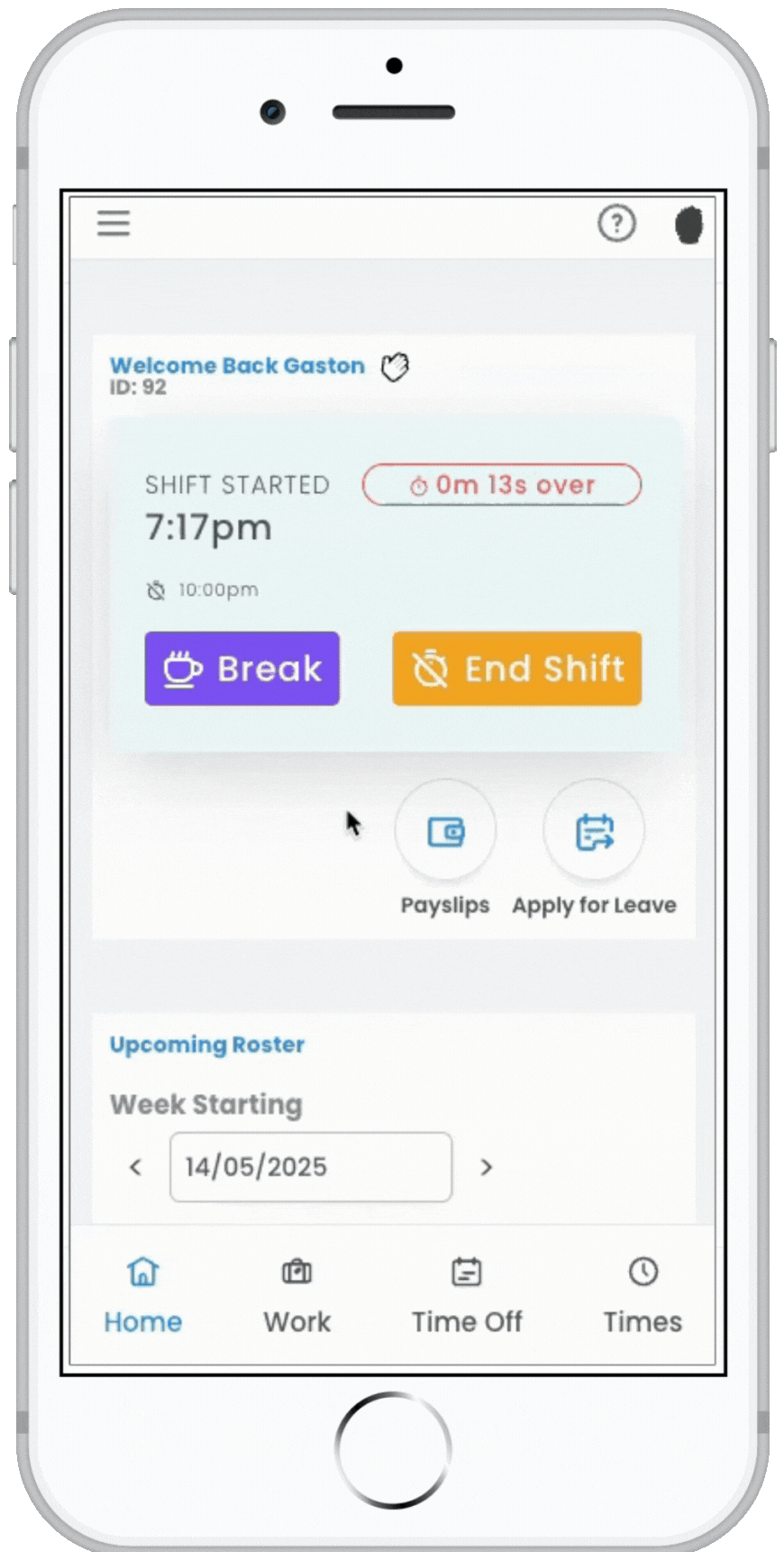 - It times out a shift. If an employee forgets to end their shift, they won't have to end it when returning for their next shift; they can simply clock into their current shift instead.