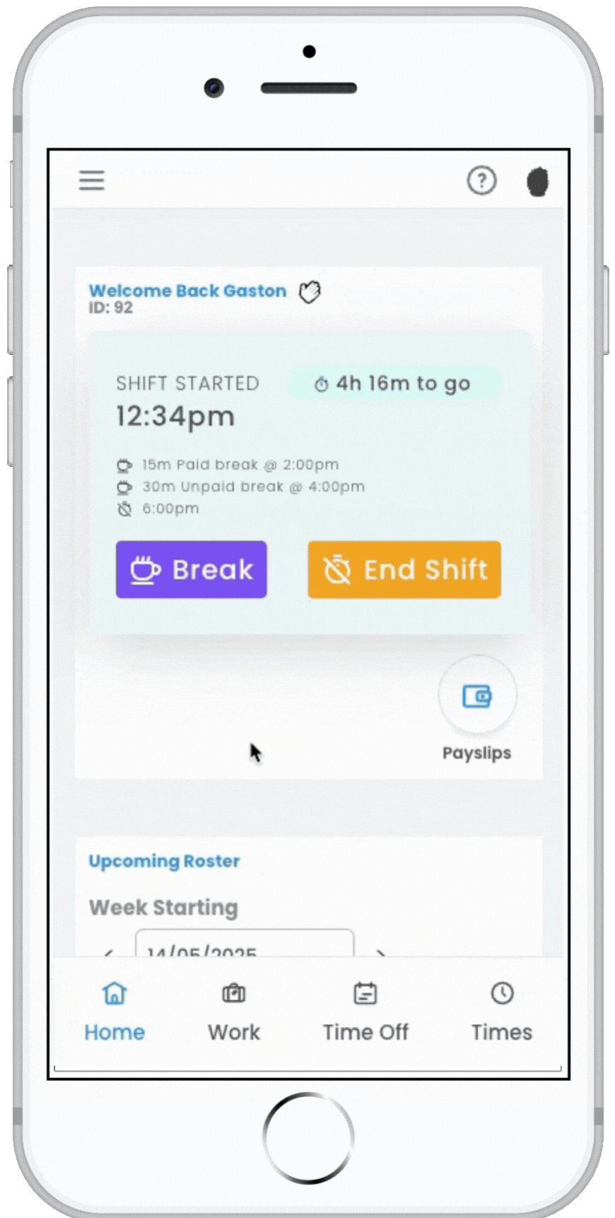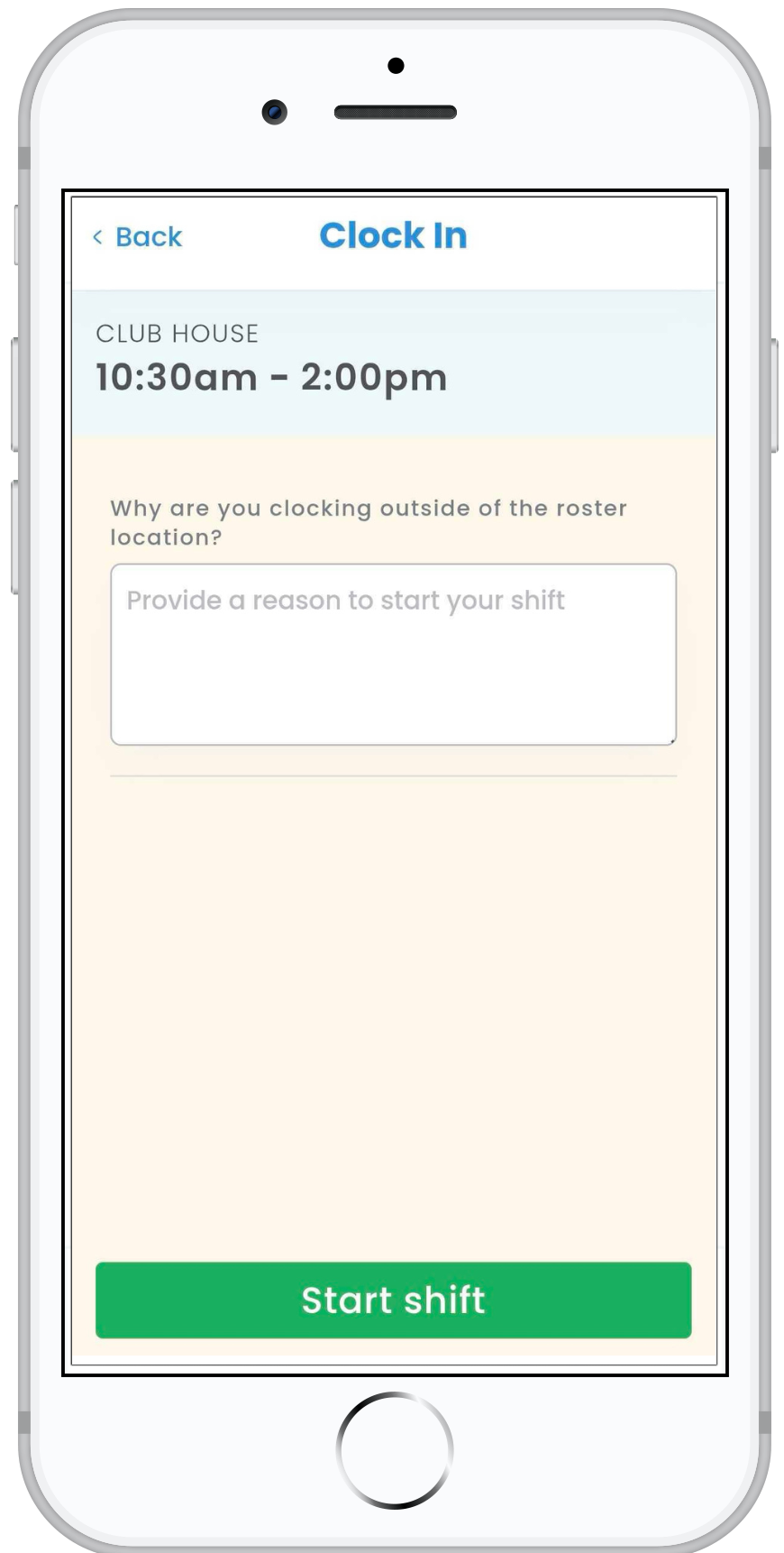 Please note: If an employee accidentally ends their shift instead of starting a break, this action is irreversible. They must Start shift to resume working, creating a second unrostered shift where they can explain the reason using a comment field.