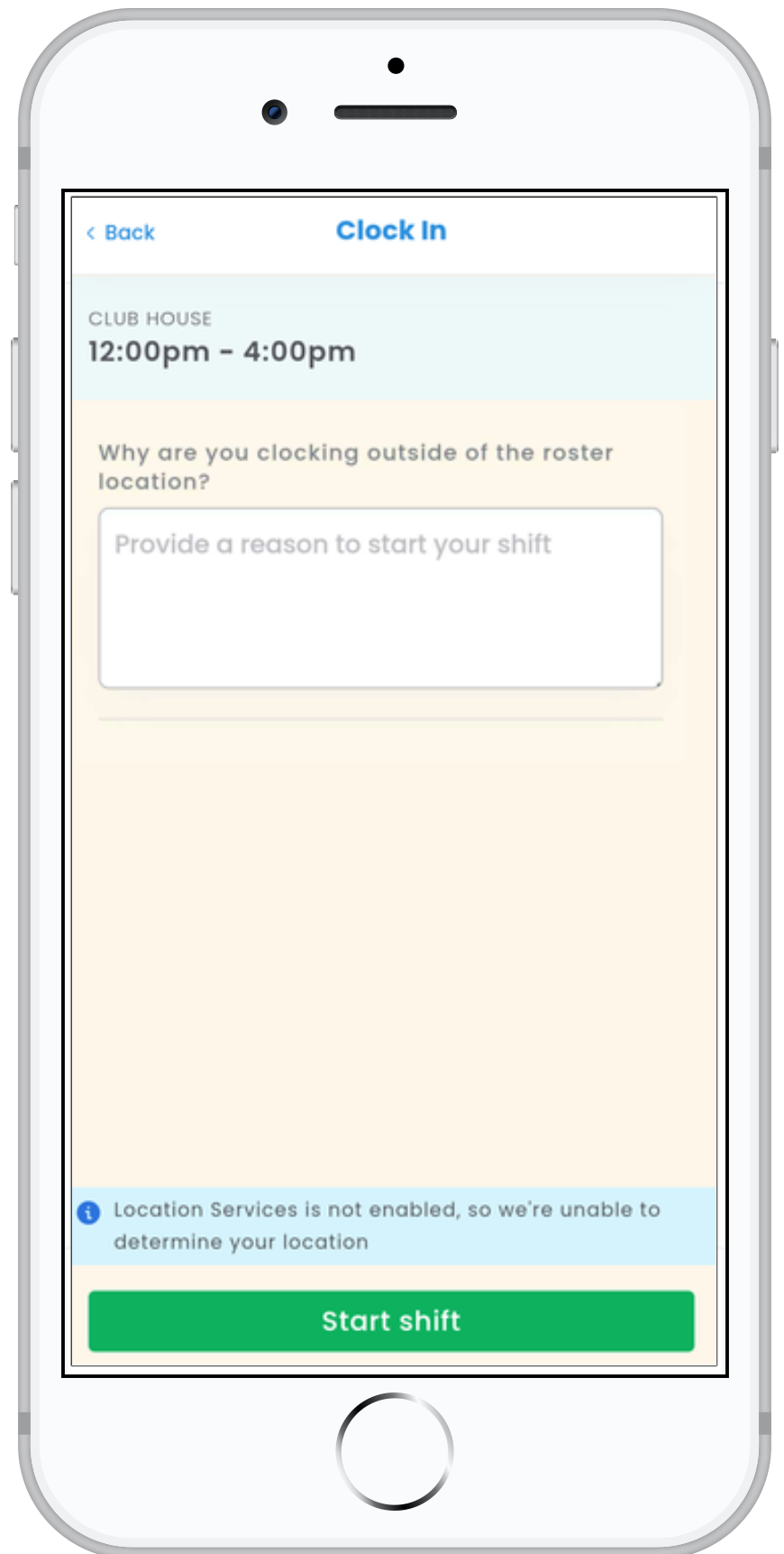 Employees may receive a location error when trying to Start their shifts for a few reasons: