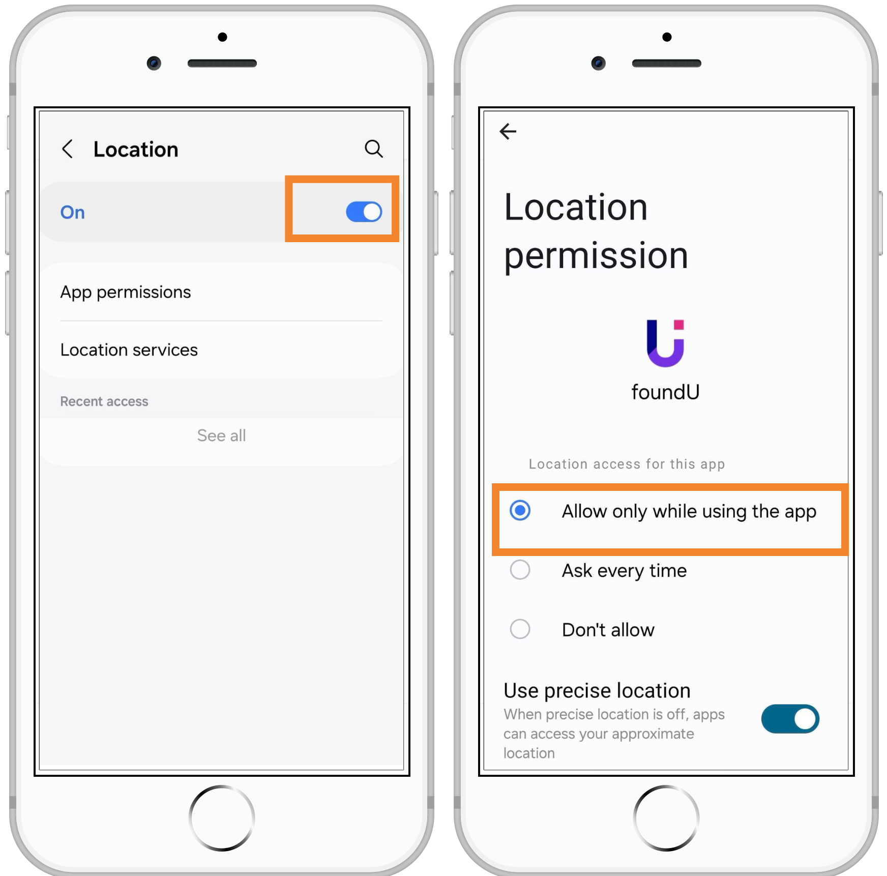 - Locate the foundU app and select Allow only while using the app.
