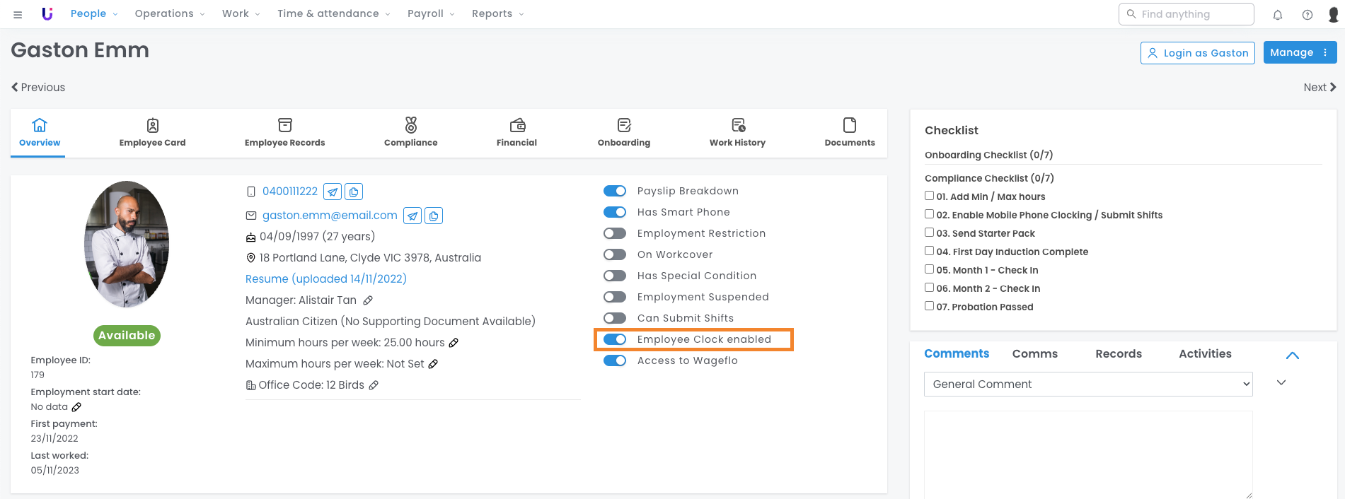 - In the Employee profile, enable the toggle for 'Employee Clock Enabled'.