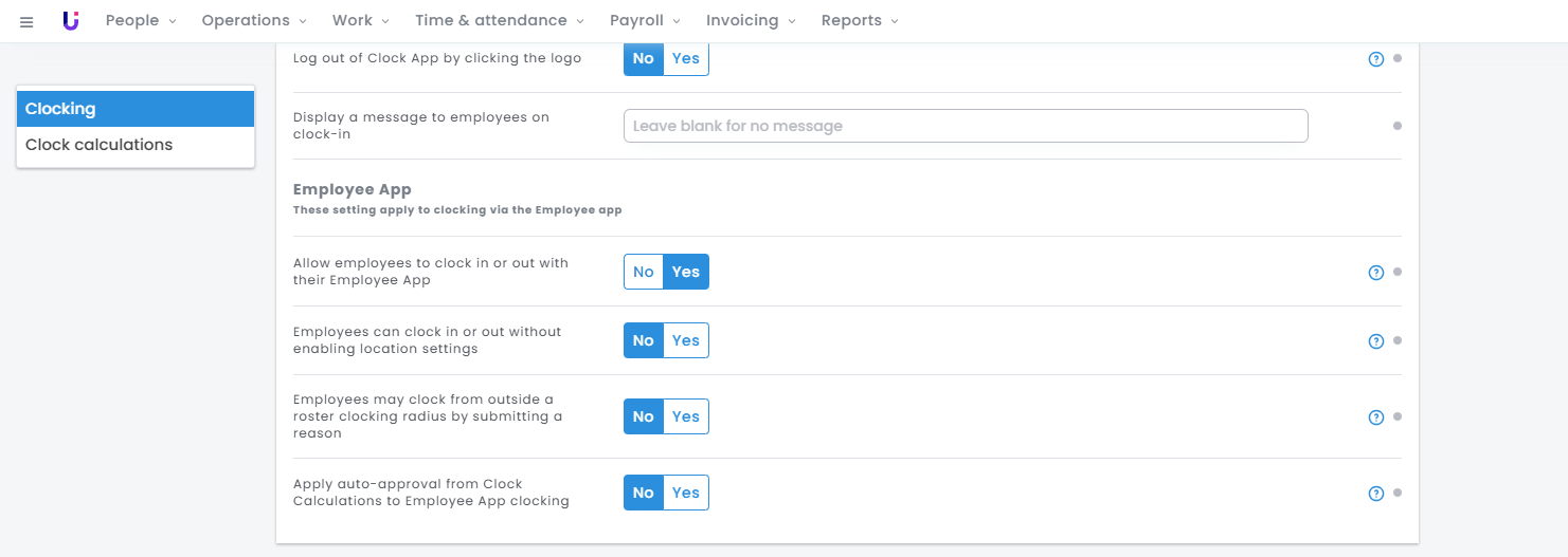 Hot tip: The Clock Settings page sets the default settings for your platform. You can override these per Operation, enabling Employee App clocking for a portion of your workforce.