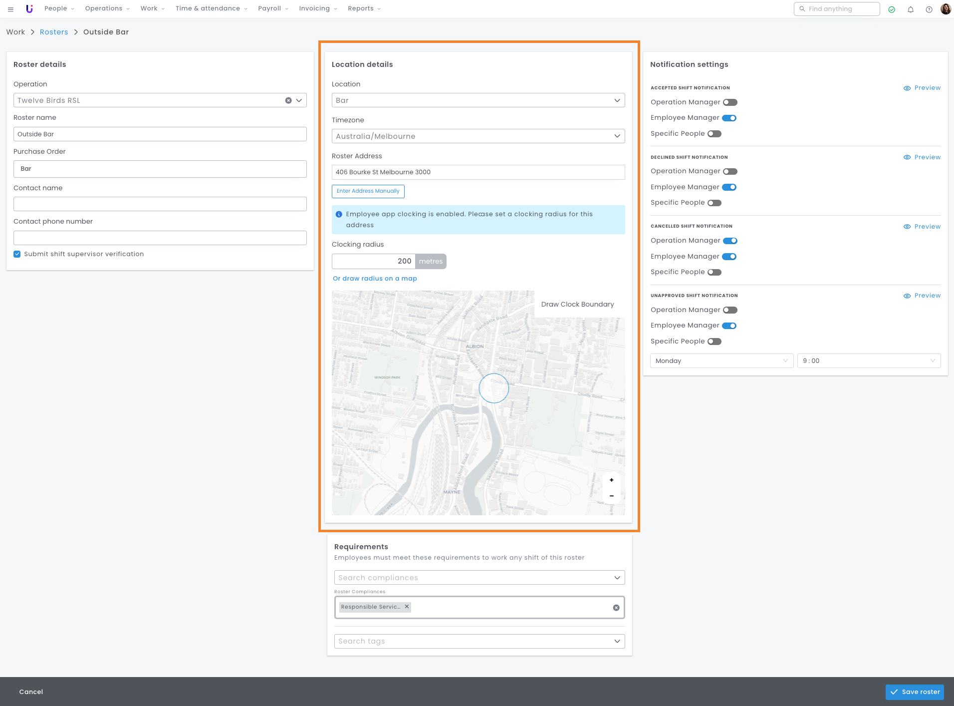 The boundary zone or area from which employees can clock is set each time you add a new roster and can be edited when needed.