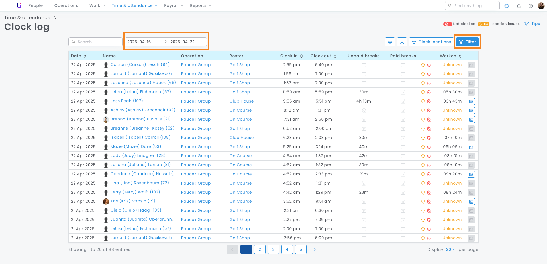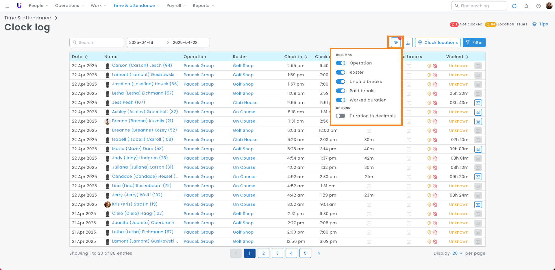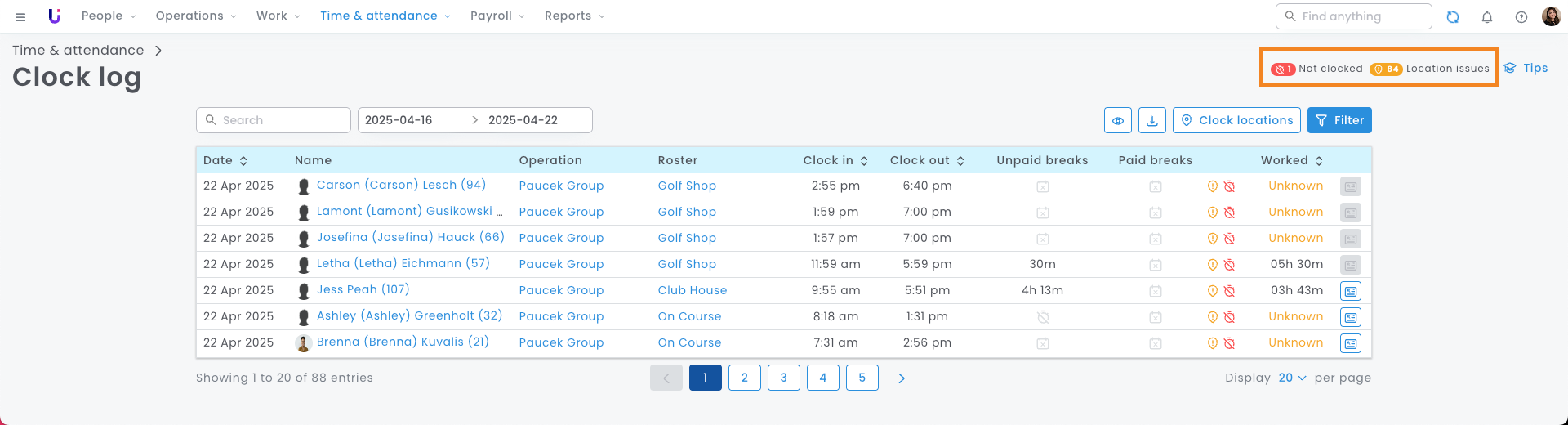 Hot Tip: Select 'Clock locations' to see a map of pin-dropped locations where your employees have clocked in and out.