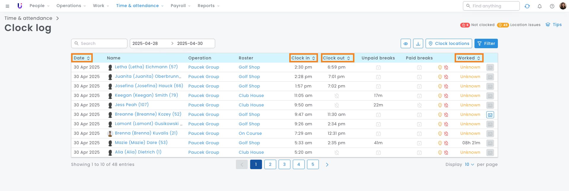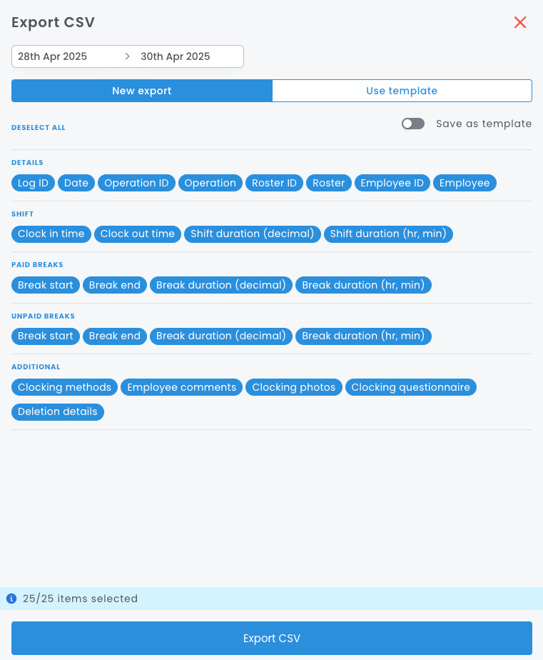 - Clock Log page - Exporting a CSV file from the Clock Log directly allows you to obtain clocking data over any given time period, for specific rosters or operations, and even for individual employees. For steps on how to do this, please see the instructions outlined in the first section of this guide.