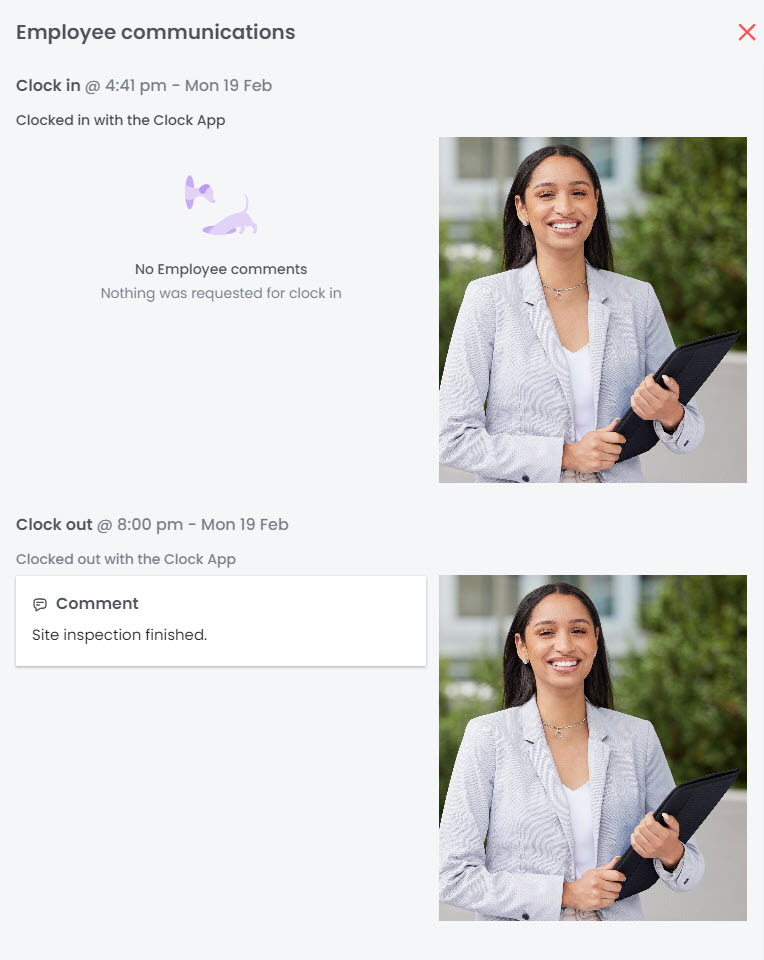 If the image icon to the right is highlighted, selecting this will allow you to see any comments made by your employee, as well as any photos taken on the iPad, while clocking in and out.