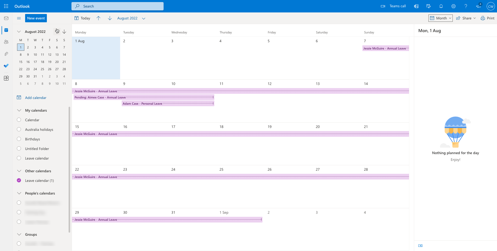 Below is an example of viewing pending and approved leave in a monthly view in Outlook.
