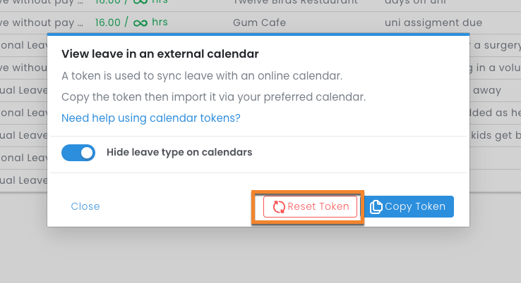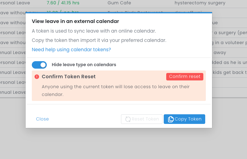 Please note: By resetting this token, anyone using the current token will lose access to any leave on their calendar. You can always create a new one and provide it to those admins after revoking it.