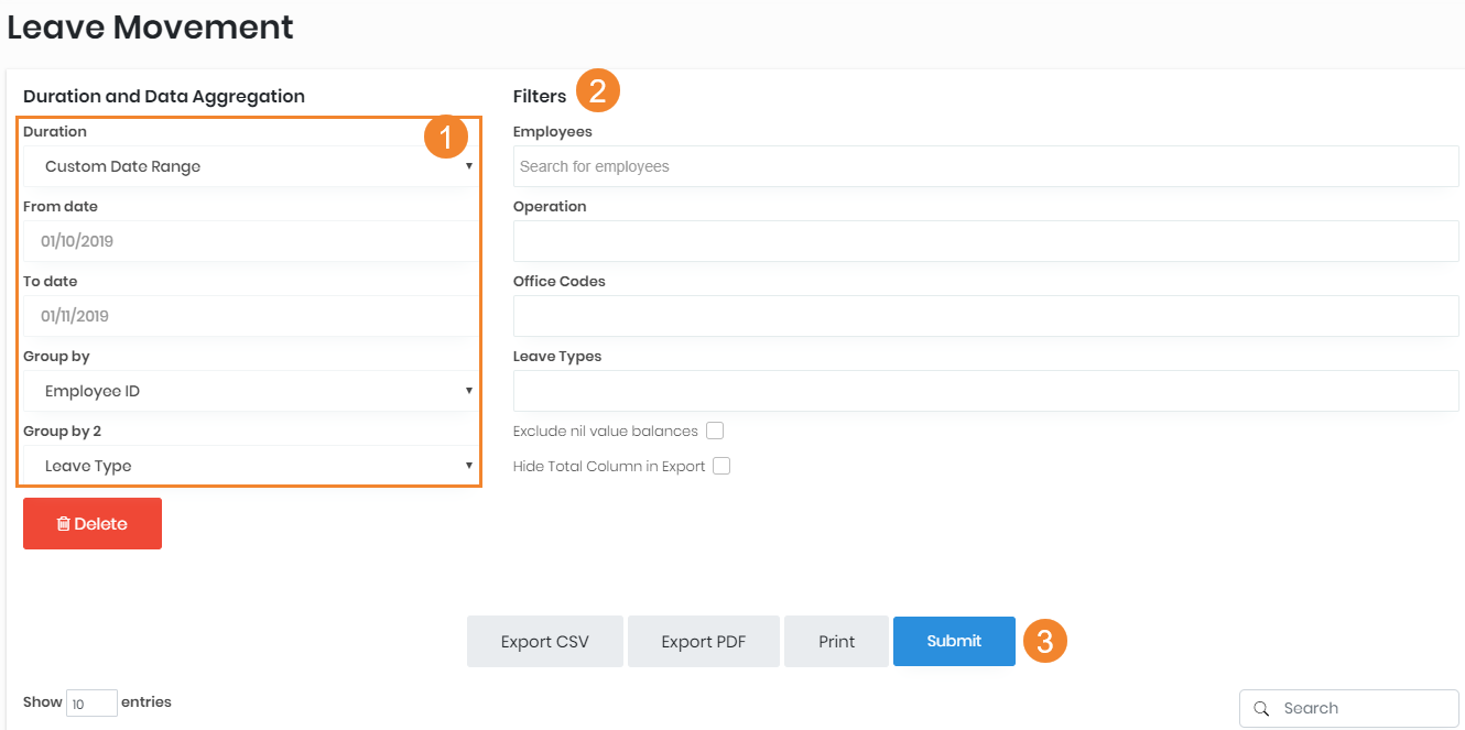 5. You can leave the filters blank to view all or choose specific filters such as Employees, Operation, Office Codes and Leave Types.