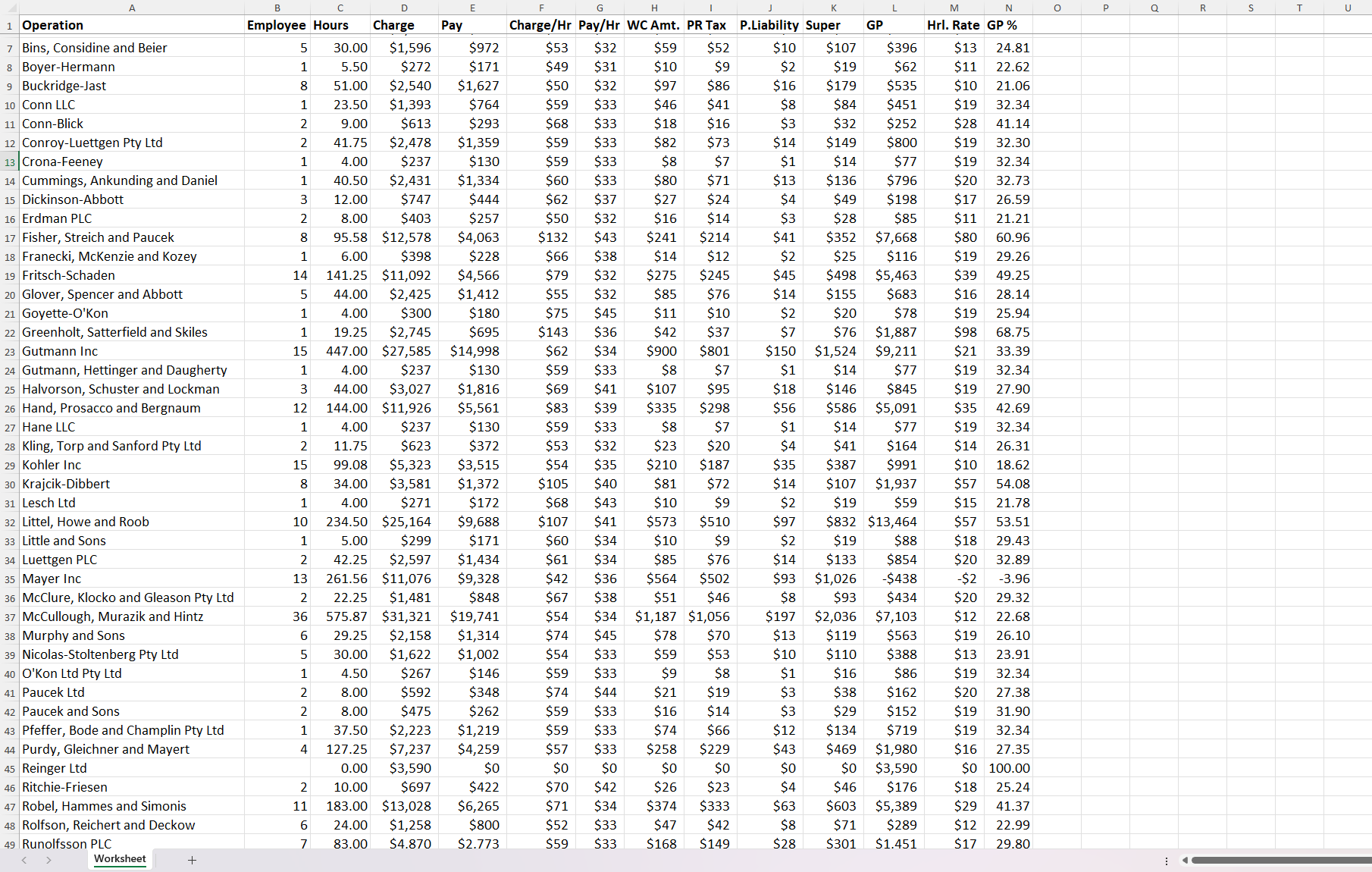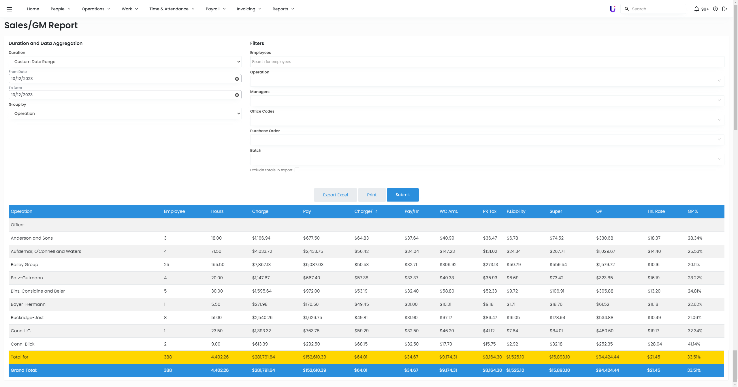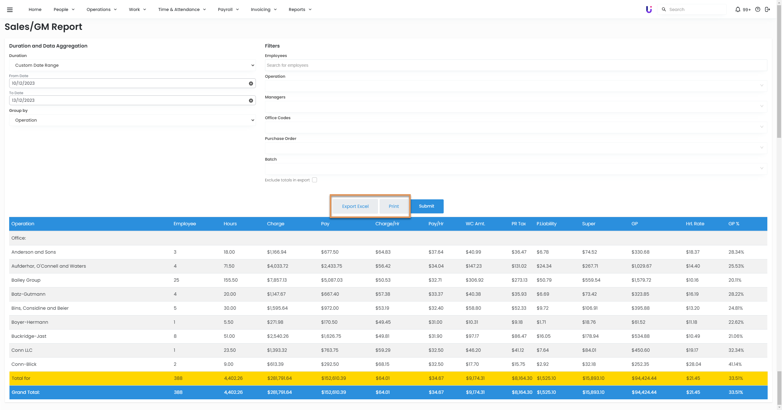 After generating your invoices for the relevant pay period, you may like to generate a Sales/GM report to easily see sales and invoice data along with how margin figures are reached by adding all oncosts columns.