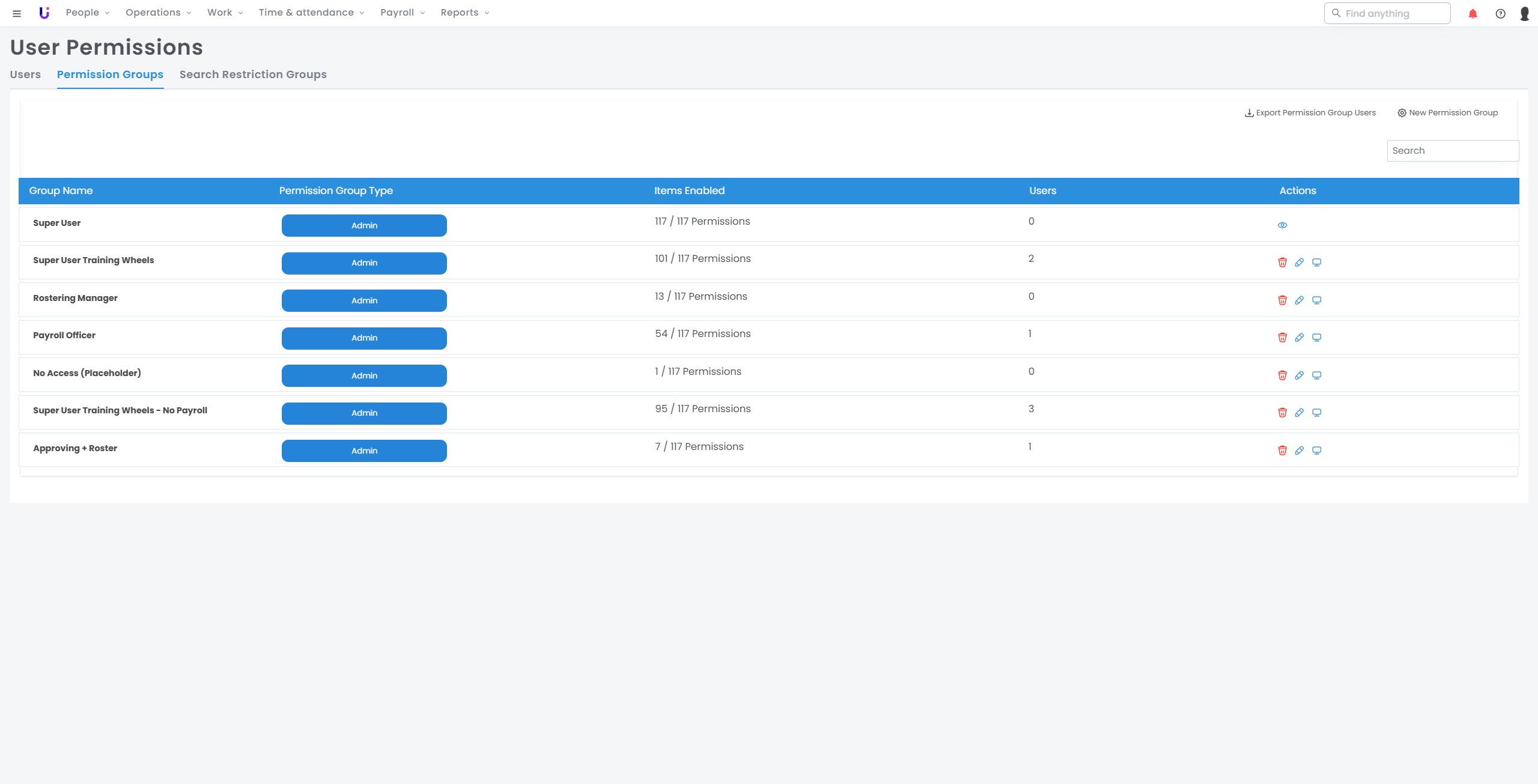 - There is a Super Admin set up with all the permissions, and then varying groups of Admins (e.g., HR, Payroll, etc.).
