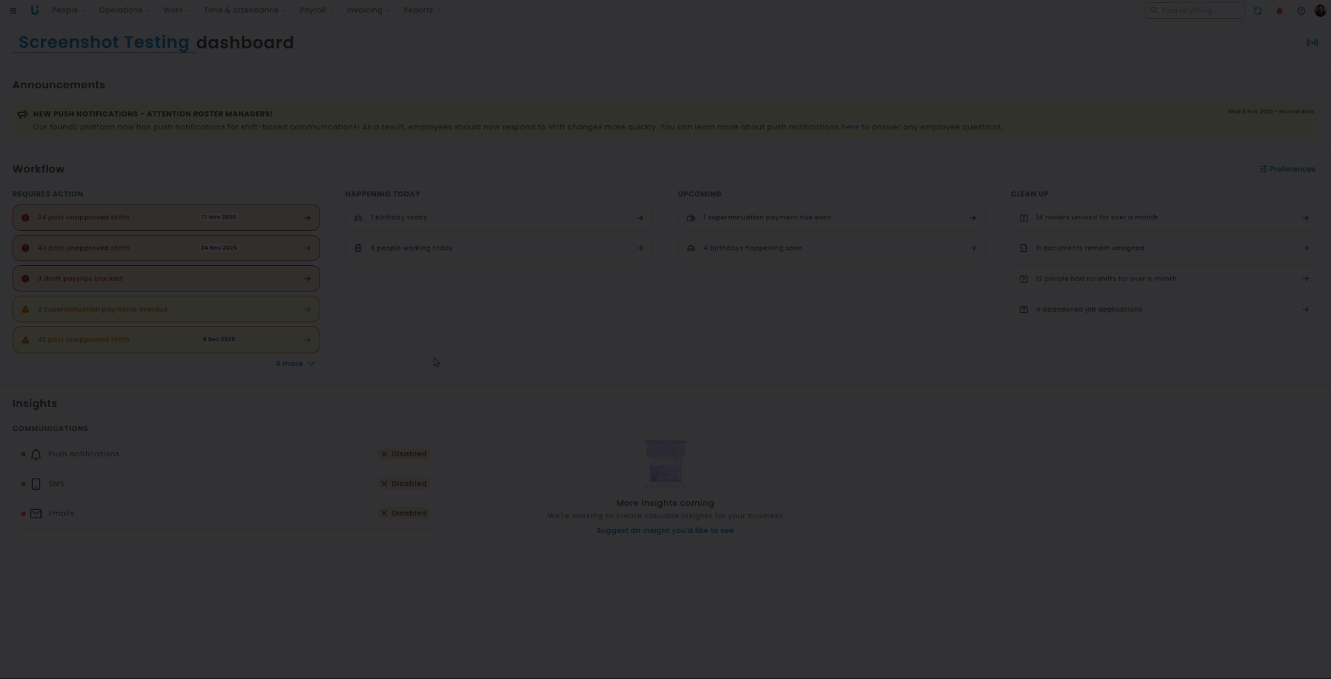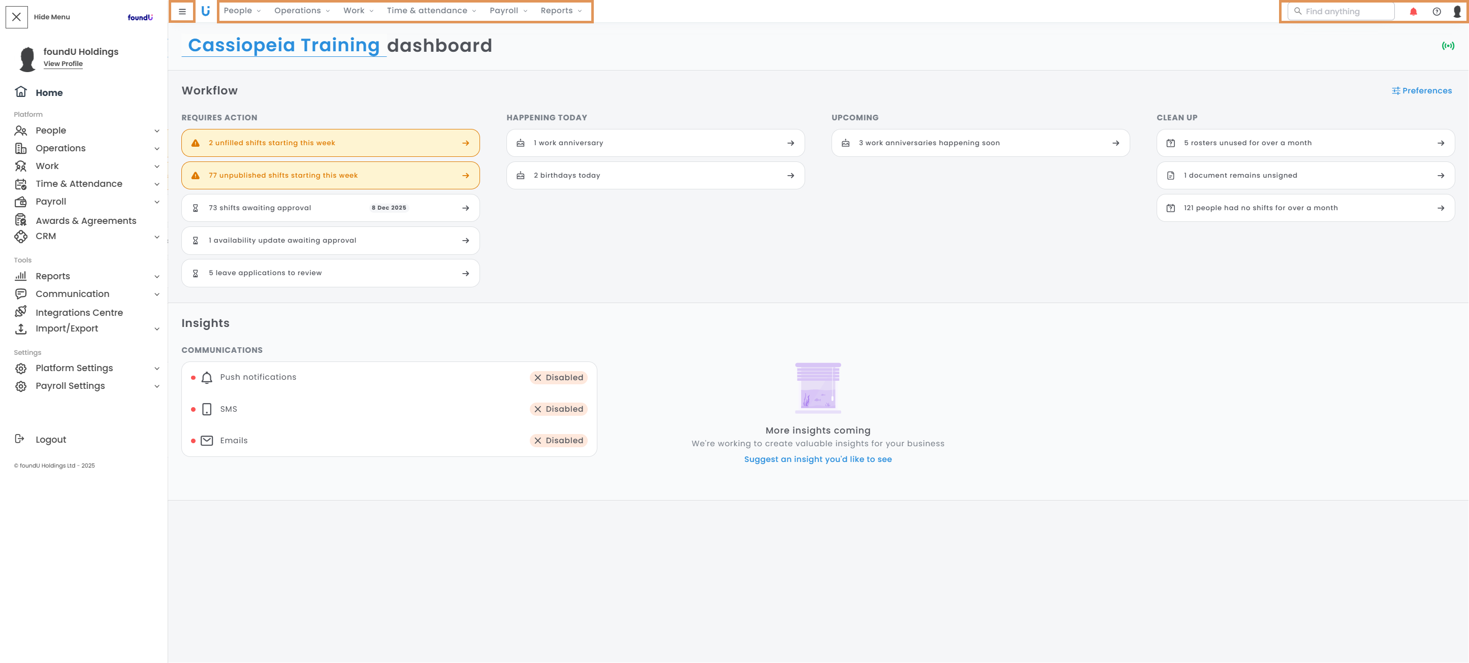 - Use the global search option to find employees and operations. Notifications will appear here, and you can access our help centre to view guides, webinars, and masterclasses, and submit help tickets to our customer help desk (located at the top of our help centre).