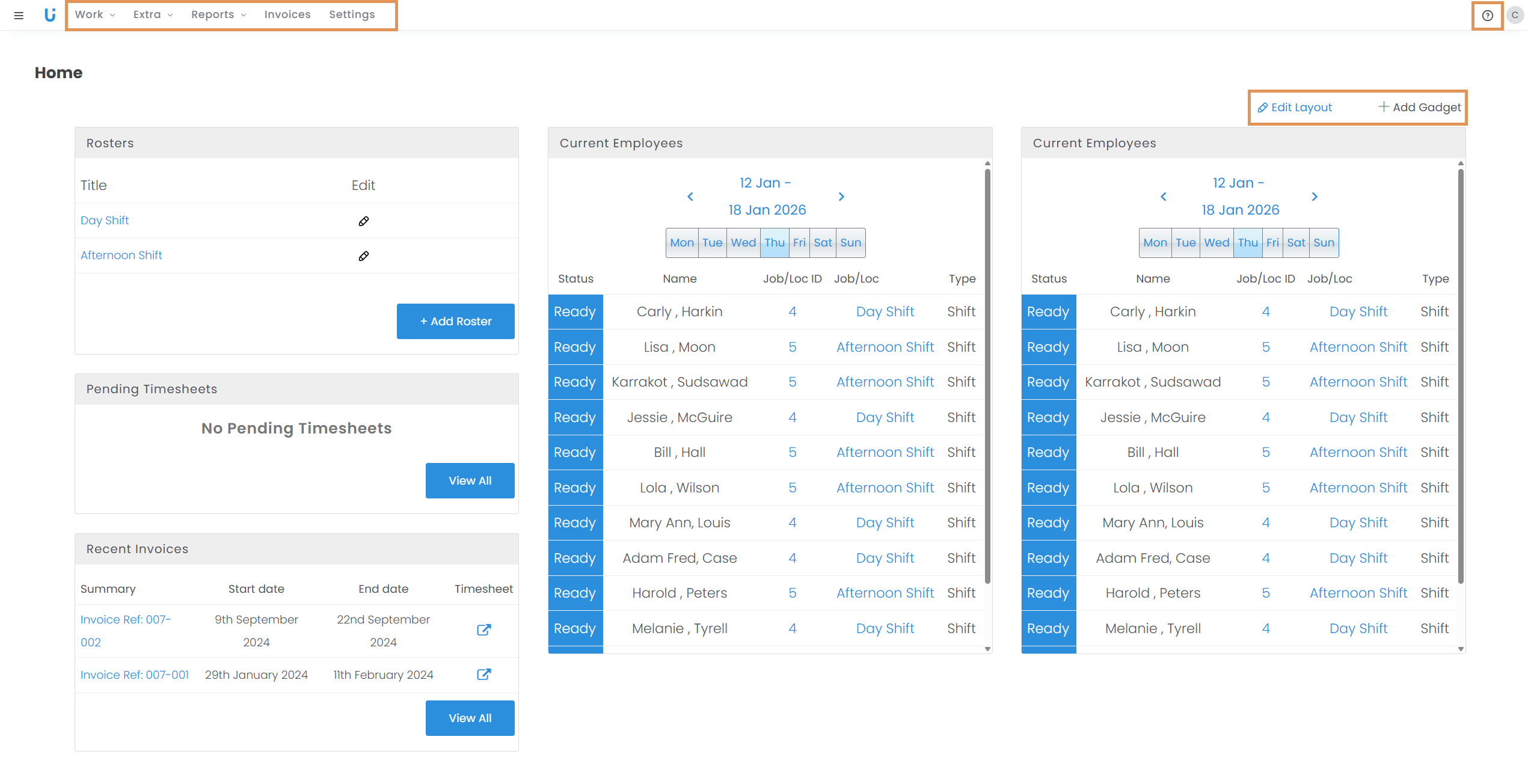 - Use the 'Add gadgets' and 'Edit Layout' options for quick access to invoices, rosters, people working, and more on your dashboard.
