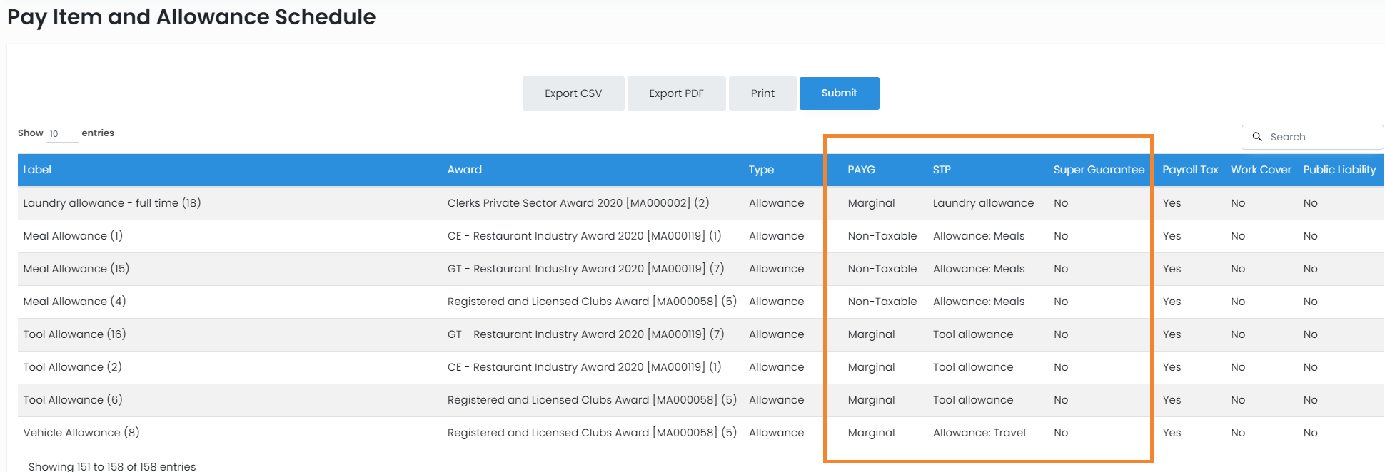The table below identifies which columns need to be included in your calculation to work out the total for each report. The 2 columns on the left are for the Advanced Payroll Activity Report and should be calculated separately. The 2 columns on the right are for the STP Report and should be calculated separately.