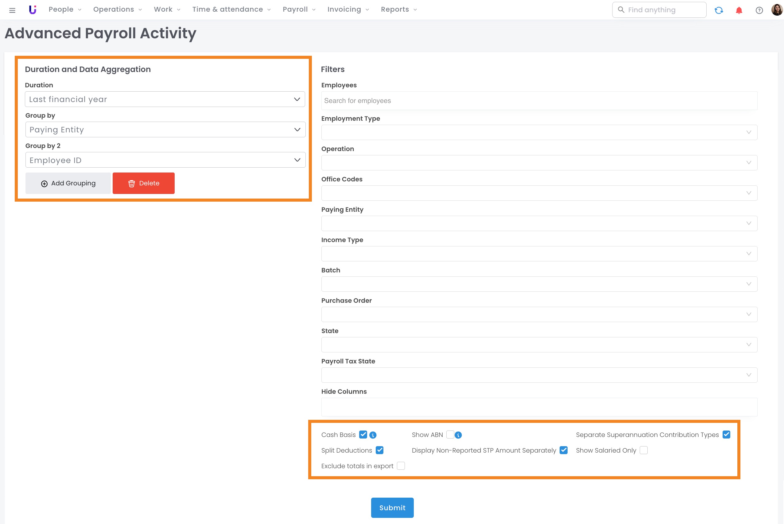 - Navigate to Reports > Financial and open the Advanced Payroll Activity Report.