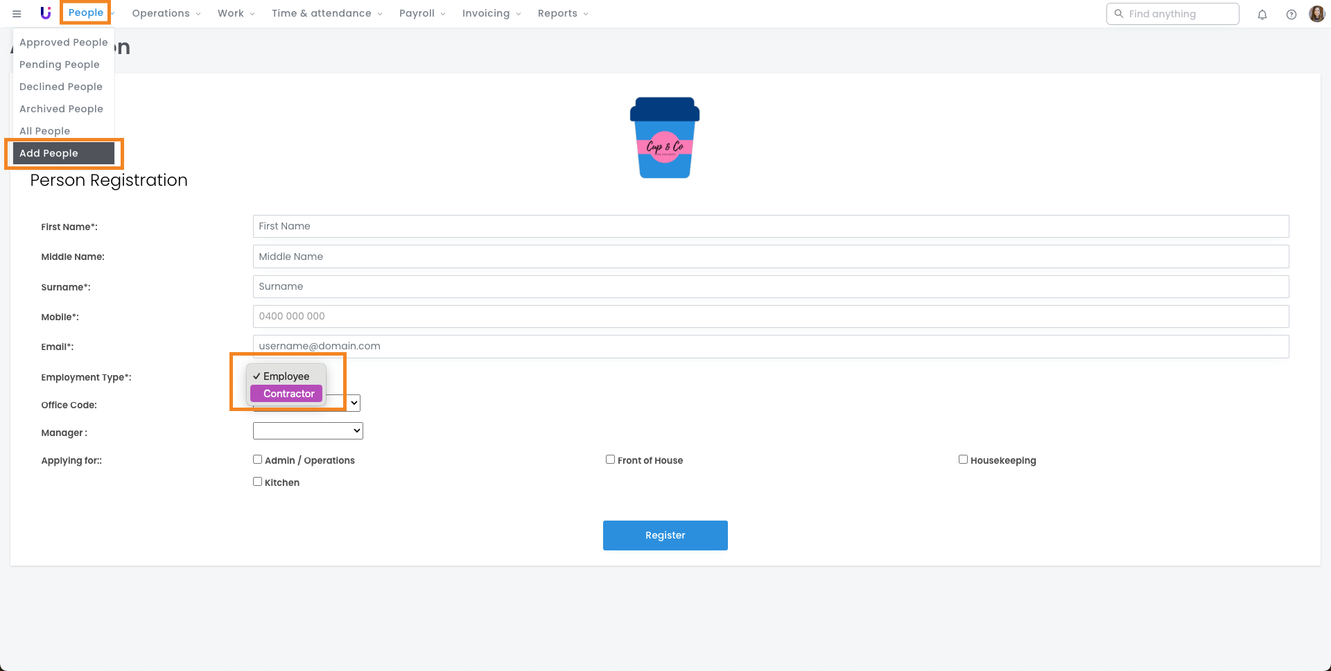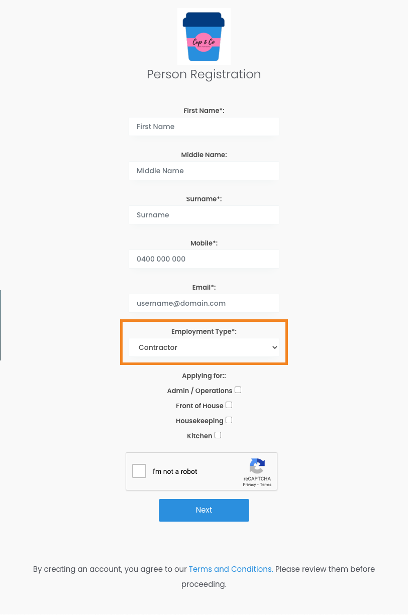 With this enabled, prospective employees and Contractors can self-register to your platform and it is mandatory for them to select their Employment Type.