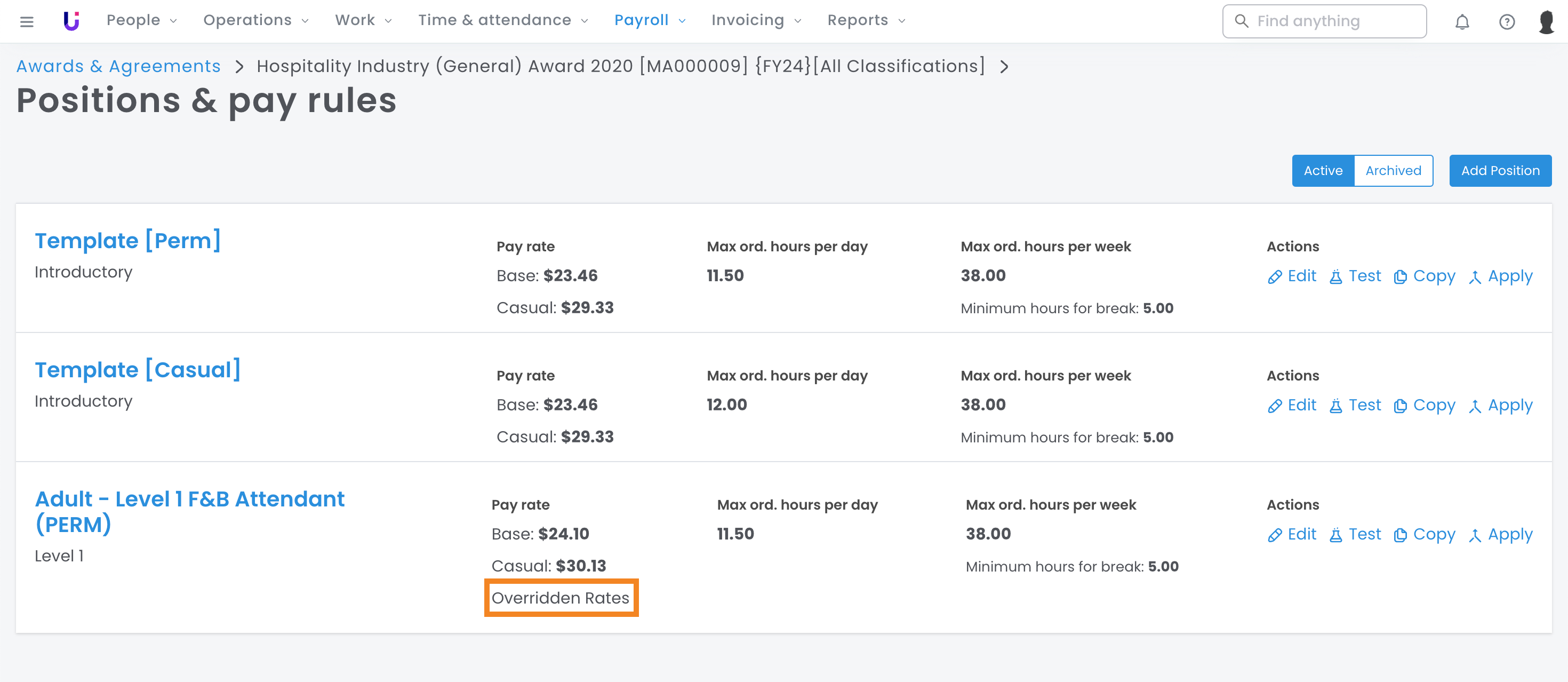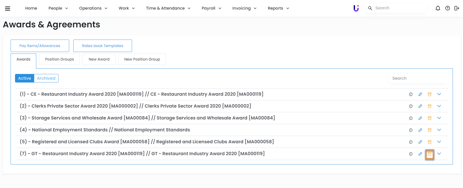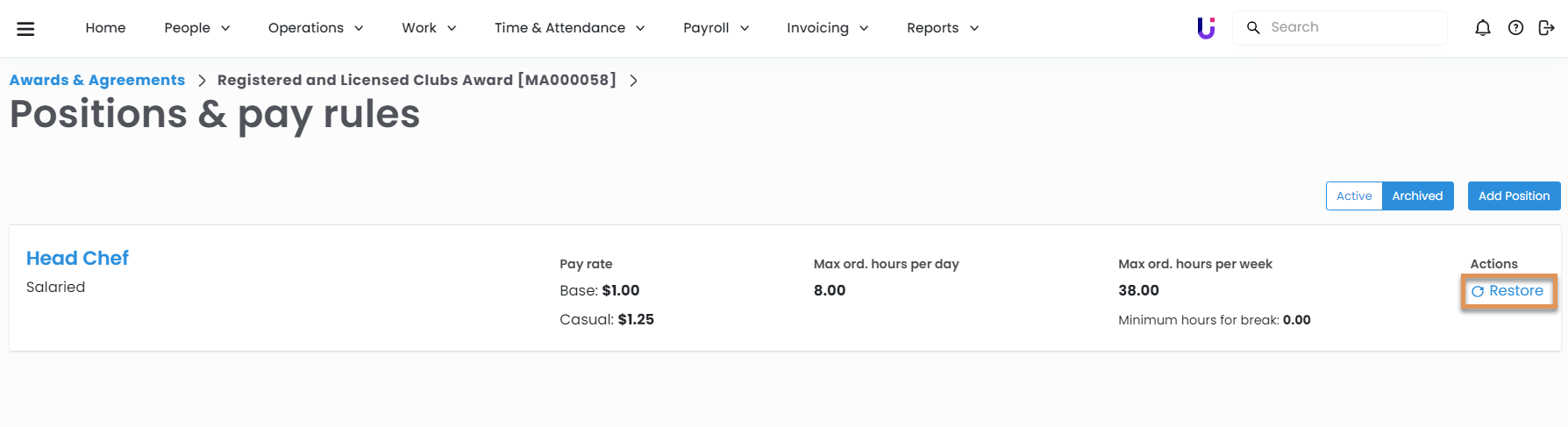 If you no longer need an individual position under an award, you can archive it. Archiving a position will prevent it from being set up on employees.