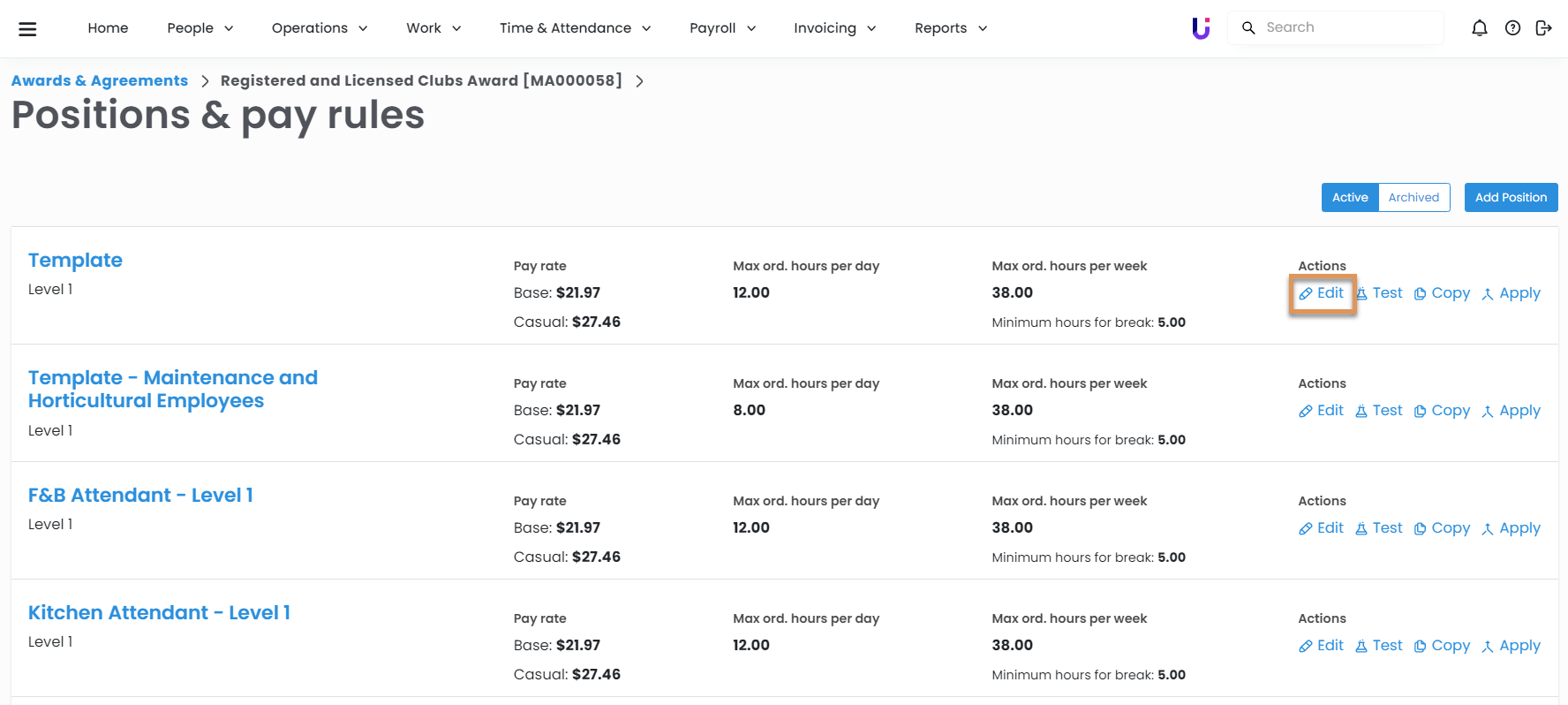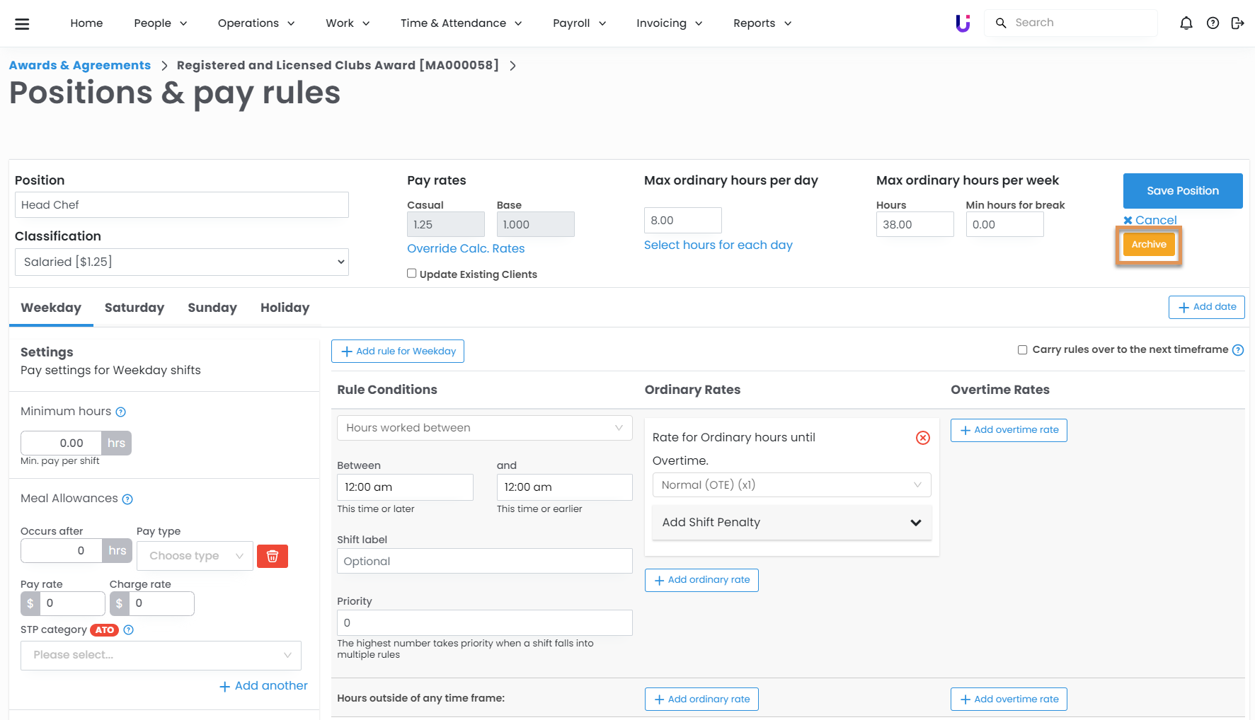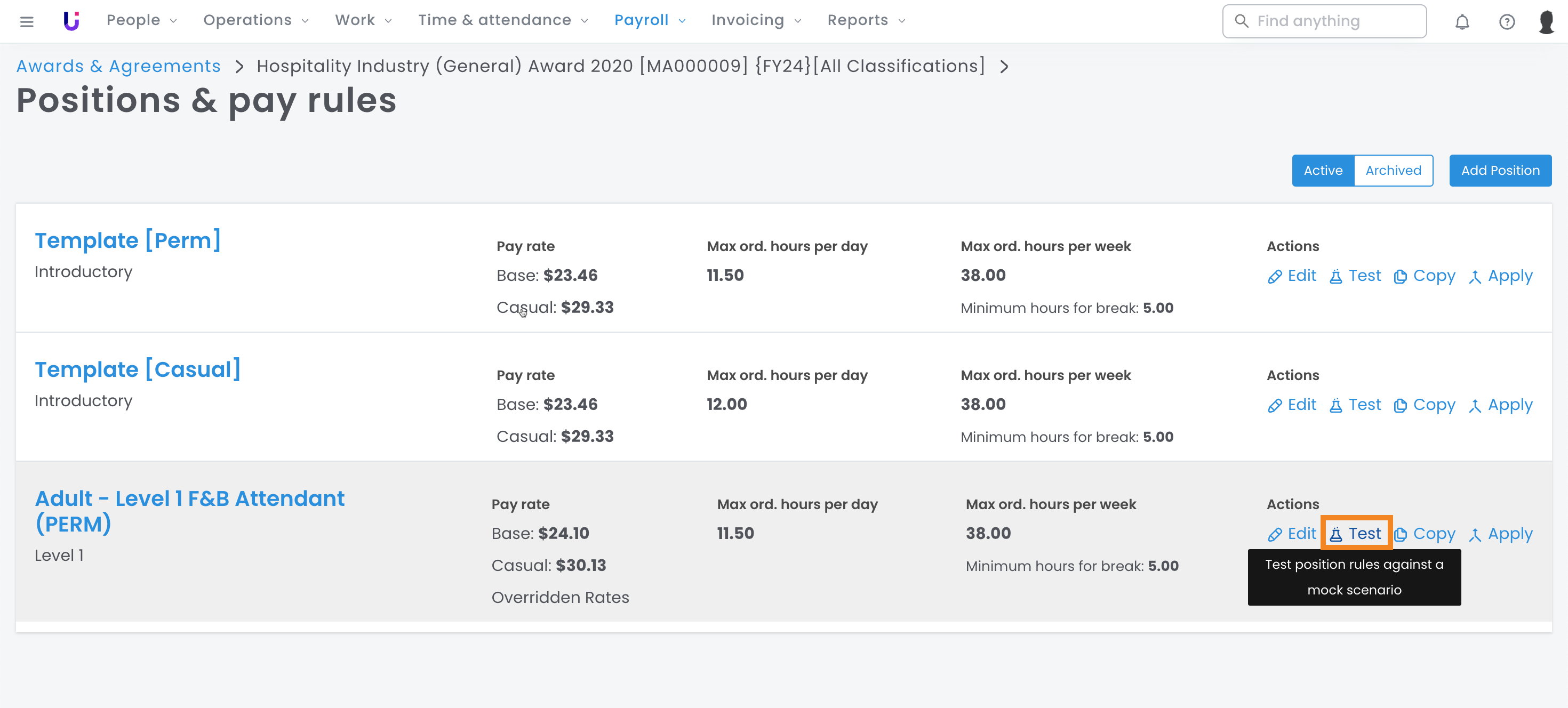 If you no longer need an individual position under an award, you can archive it. Archiving a position will prevent it from being set up on employees.
