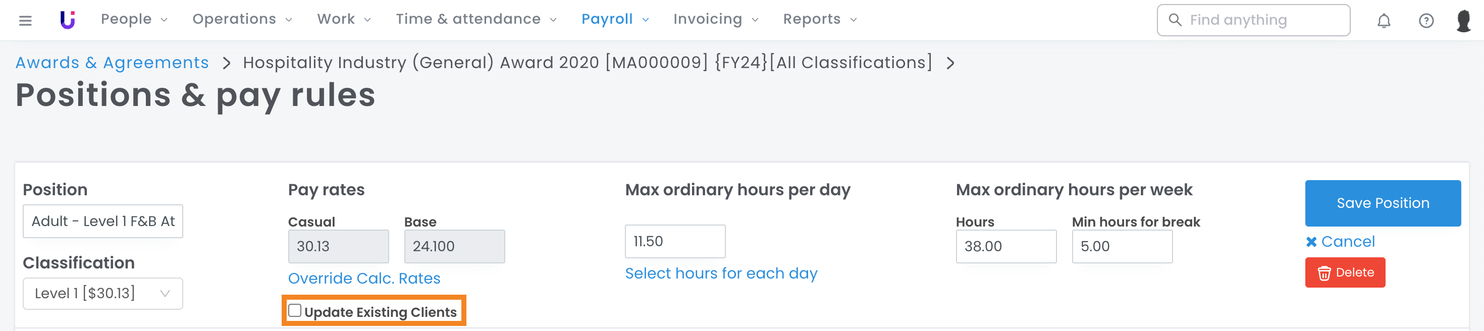 Hot tip: You will see the option to delete the position if it has not been assigned to any employees and is not sitting in any rate books. In this case, if the position is not needed, you can delete it.