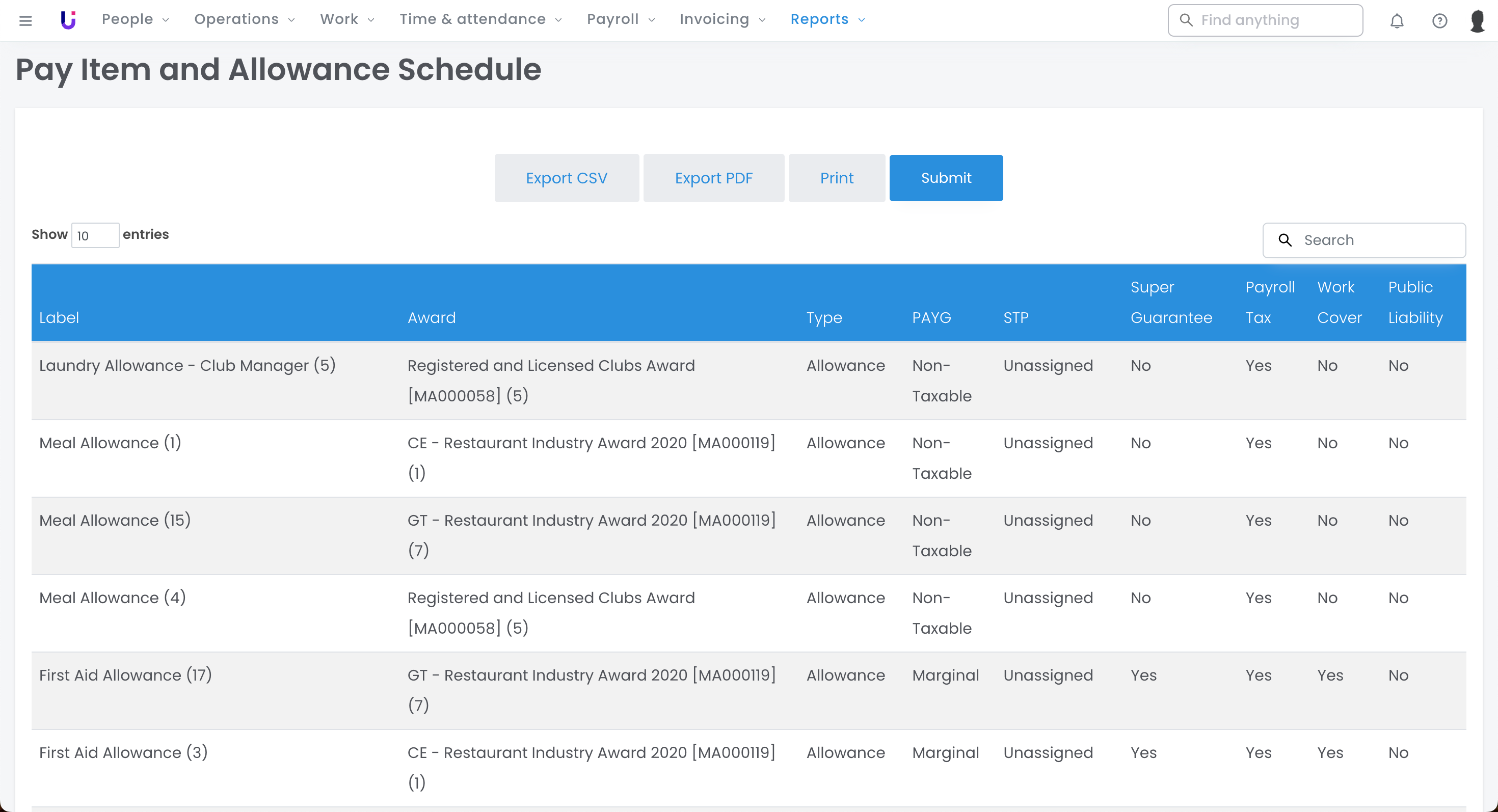 Using this report will allow you to see the complete configuration of all the pay items and allowances currently built into your platform.