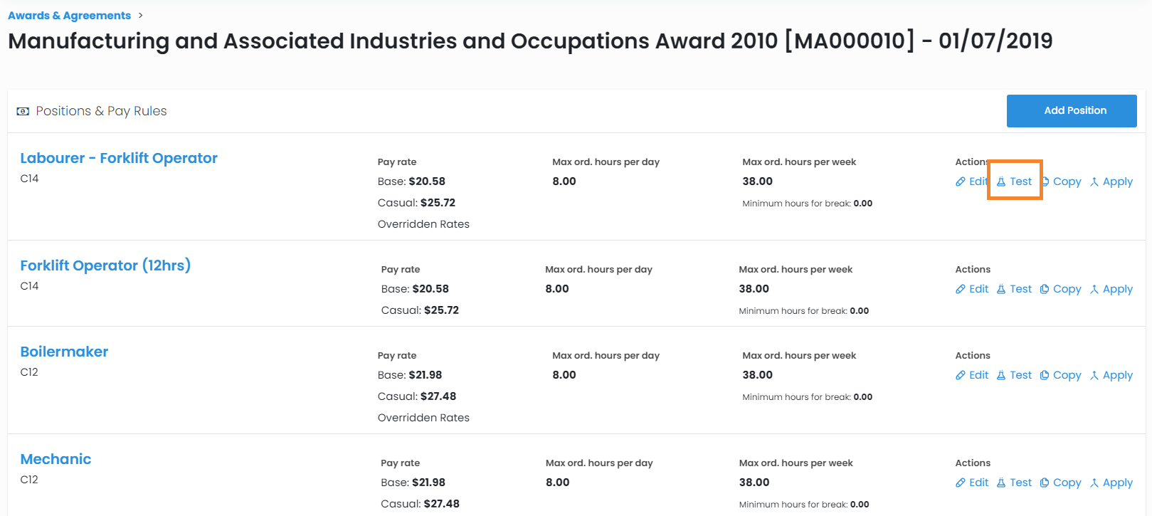 Please note: Your Rates Book may not house all the positions built in your Award. If a position is unused, it may be left out of the Rates Book.