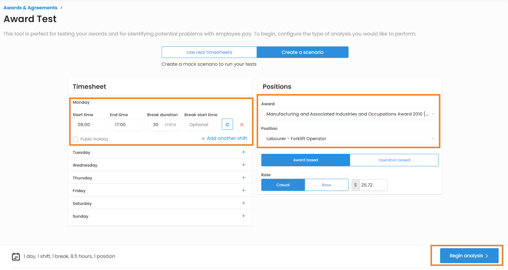 3. Your position and award will be pre-filled; you can then add shift details to the days on the left and then select Begin Analysis to test the Award interpretation.