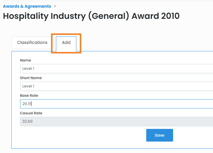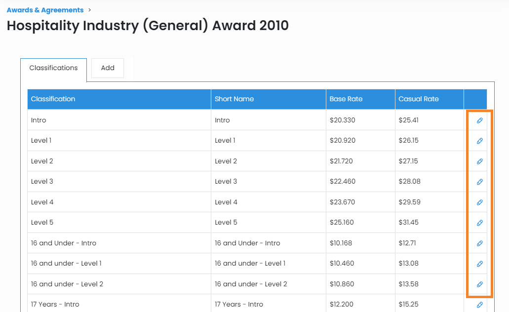 • Keep it clean - Before adding in your Classifications, think about your business and what type of employees you are hiring. We don't recommend adding every single Classification in an award to your platform.