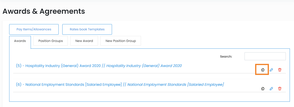 2. To the right of the award you'd like to copy, select the copy icon.
