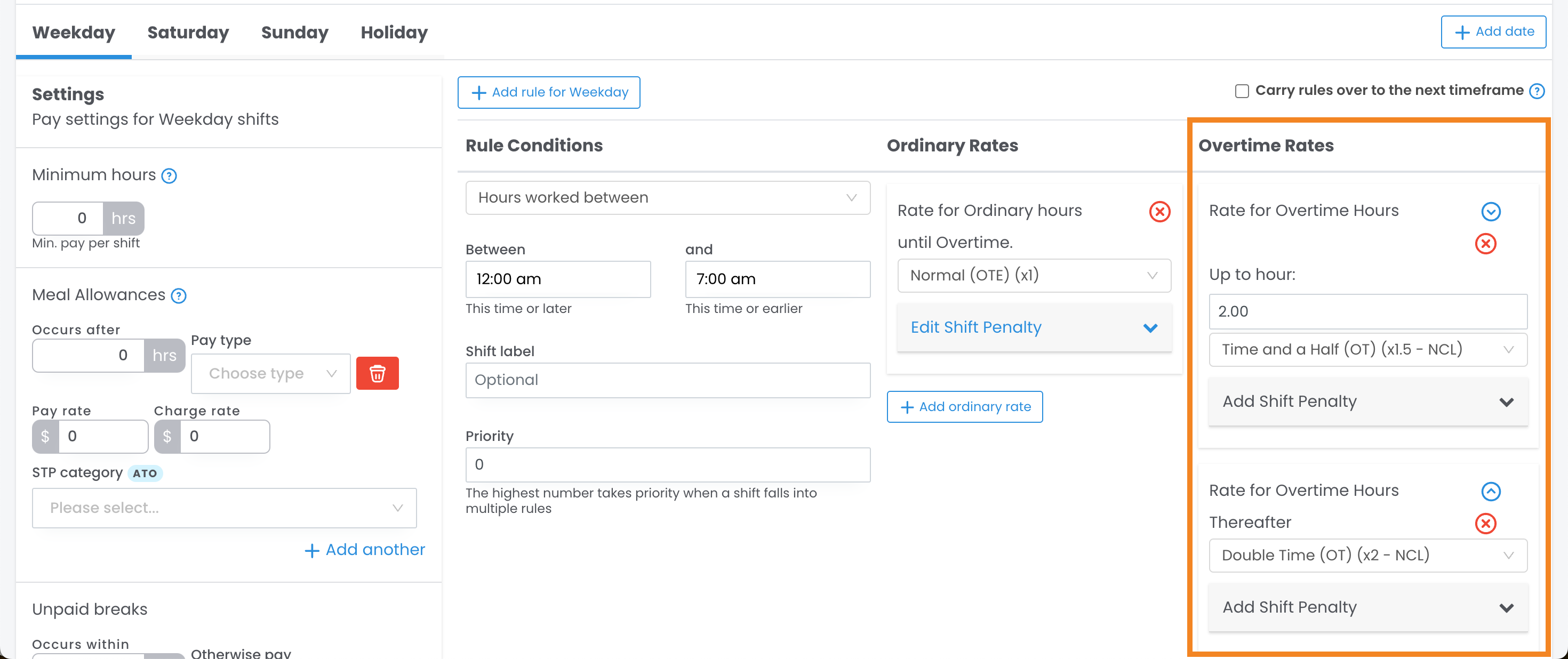 • For example, if a shift spans from 9 pm Friday to 2 am Saturday, should the employee be paid weekday rates for the entire shift? Or should they be paid 3 hours at the weekday rate and 2 hours at the Saturday rate?