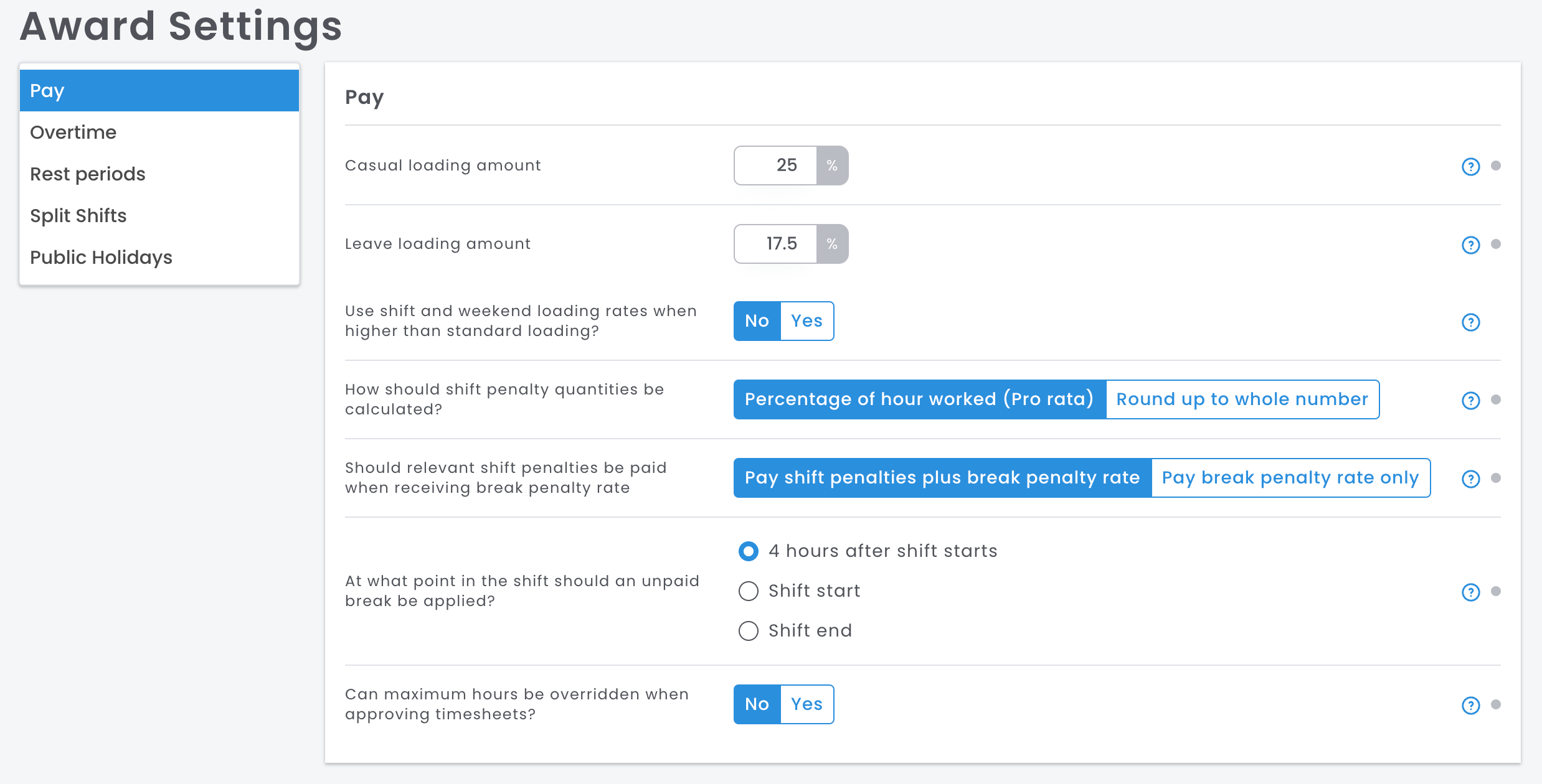 • Casual Loading - Casual Loading is the percentage used to calculate your casual employee's pay rates from the Base Rate. Across most modern awards, 25% is the standard loading. If your award uses a different percentage, this can be updated in the Award Settings.