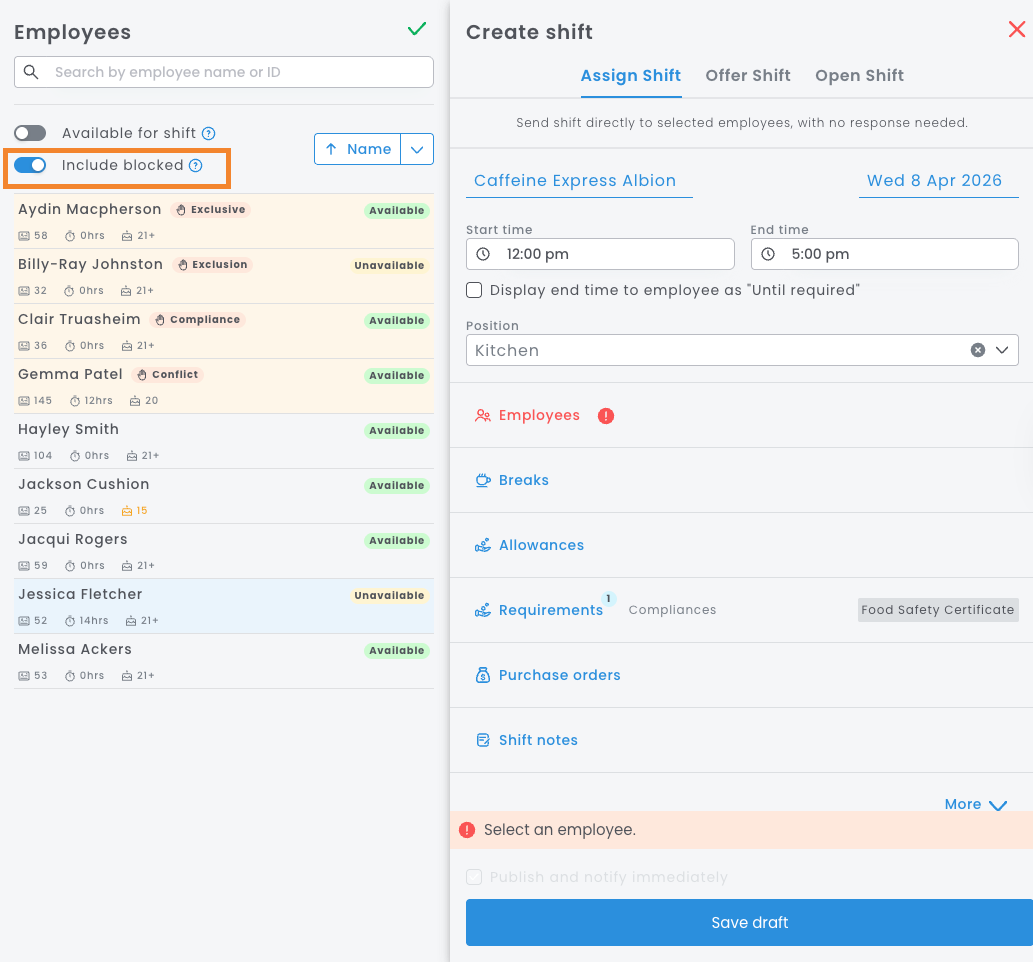 Hot tip: To see why an employee has been blocked, which may be for multiple reasons, hover over the blocked status in the employee selector for more details.