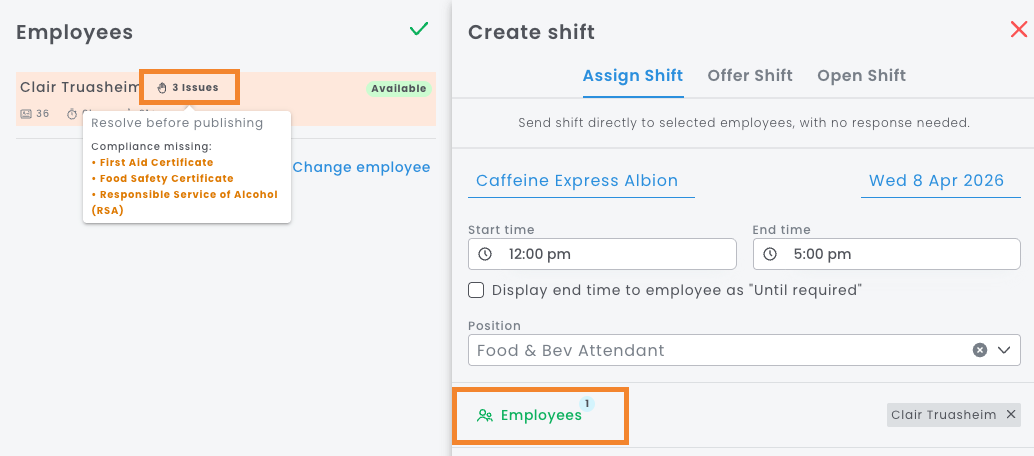 In the video below, we see that when creating a shift for Barista, James cannot be selected because the list filters only for employees with eligible Barista positions. To include him, we cleared the filter and selected a different position.