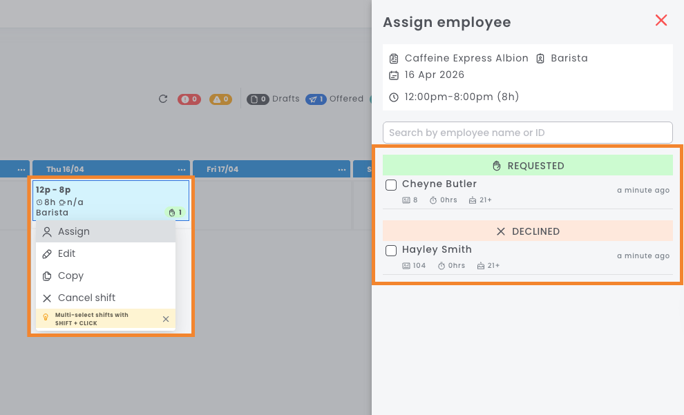Shortlist - This allows you to review interested employees before assigning the shift. Employees will appear on the shortlist only after they've requested or declined to work the shift. If the list is empty, it simply means no one has expressed interest yet.