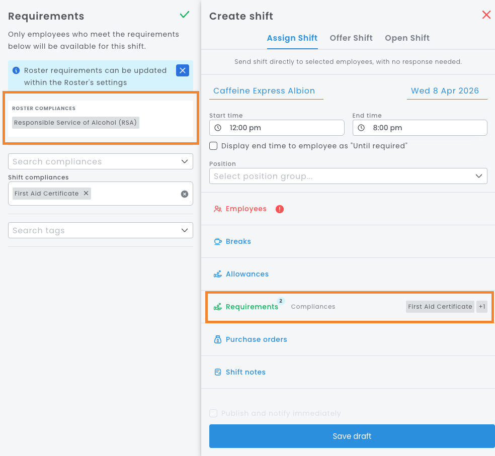 Shift Requirement - You can also set requirements on individual shifts in addition to setting roster requirements. This means only employees who have both sets of requirements can be added to a shift.