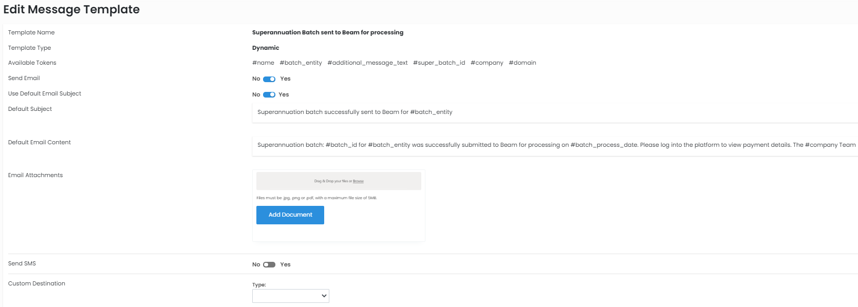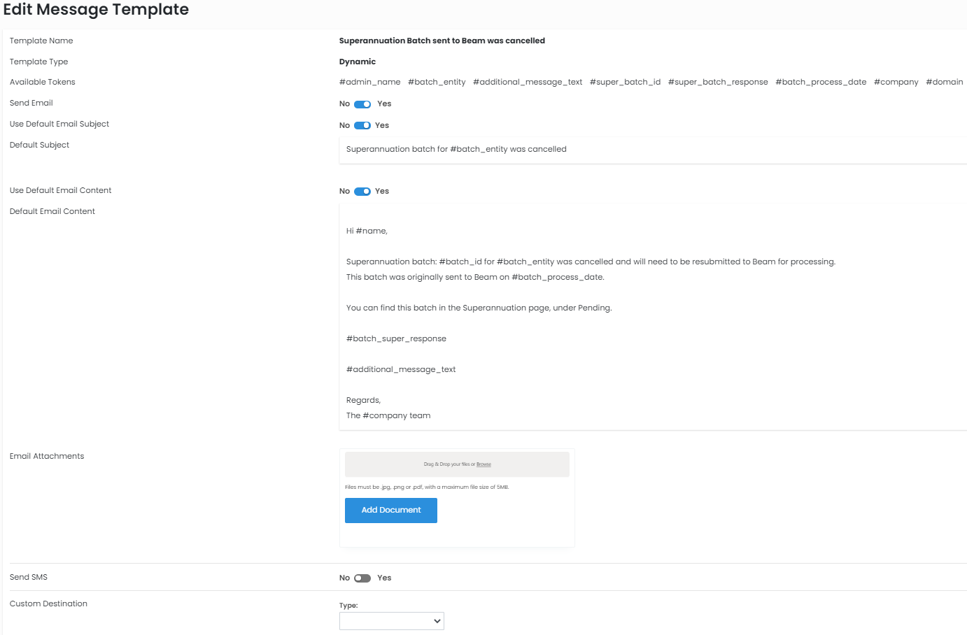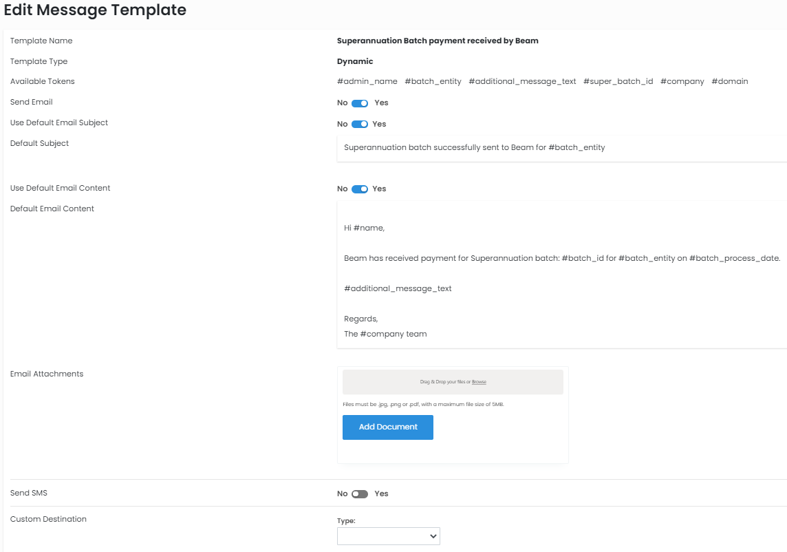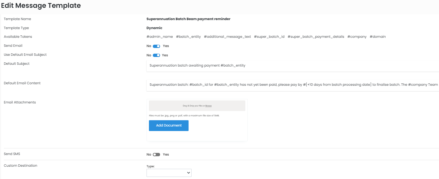- The Beam payment reminder notification is sent 5 days after sending a Superannuation batch to Beam without payment indicating that the payment is still required.