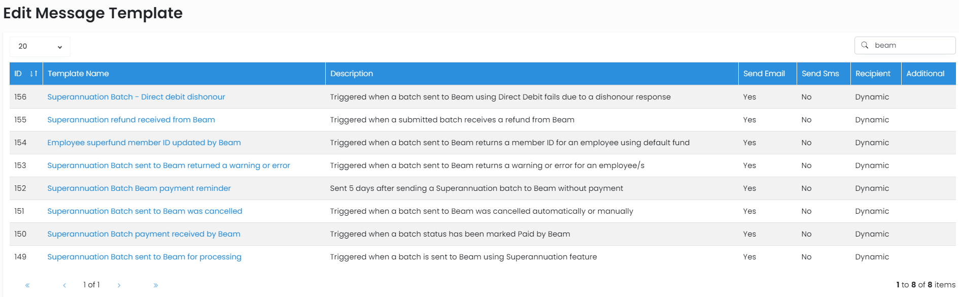 The below Beam communication templates are located in Communication > Communication content can be customised when receiving notifications regarding your Beam integration.