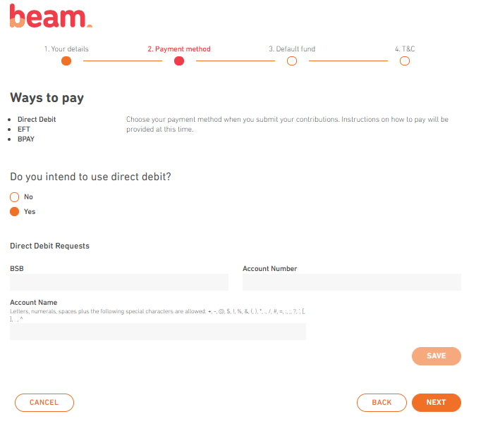 If you have multiple direct debit accounts, ensure to also review to ensure you have select your primary account, which then becomes your default account when paying super via Beam.