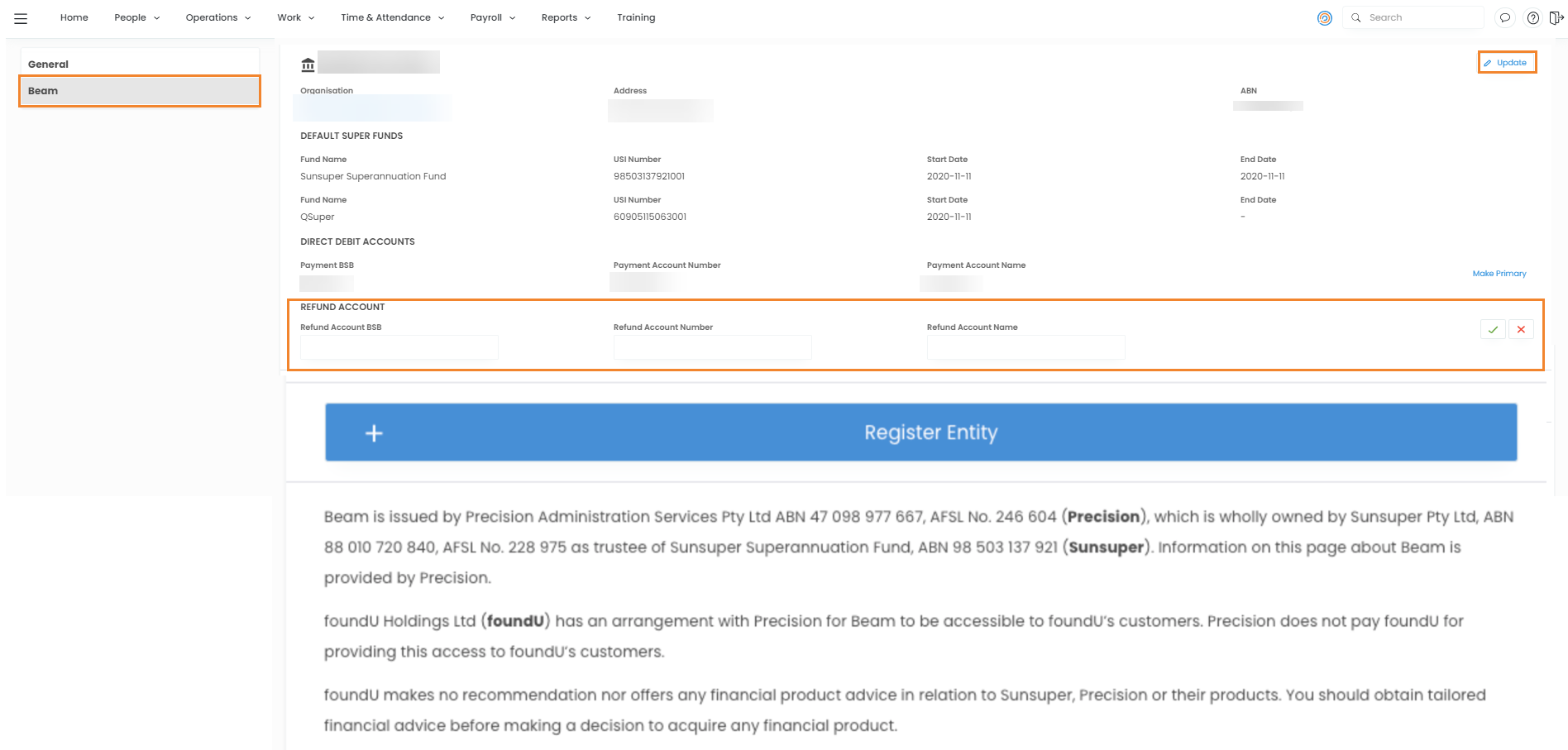 - To update your Beam direct debit details, navigate to your Beam settings via hamburger icon> full menu> Payroll settings > Superannuation >Beam settings and select update and choose either Update organisation details. This will take you to Beam where you can update your payment details including direct debit details.
