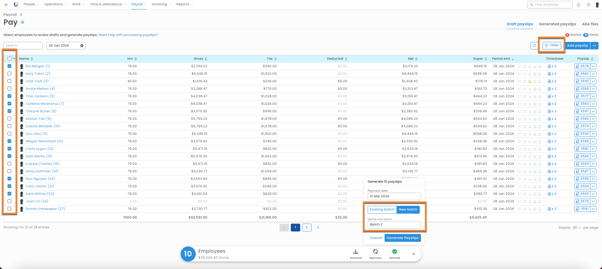 Hot tip: Filters can be applied to payslips for specific Office Codes, Operations, and Employment Types. - From the floating menu, select Generate to open the batching modal.