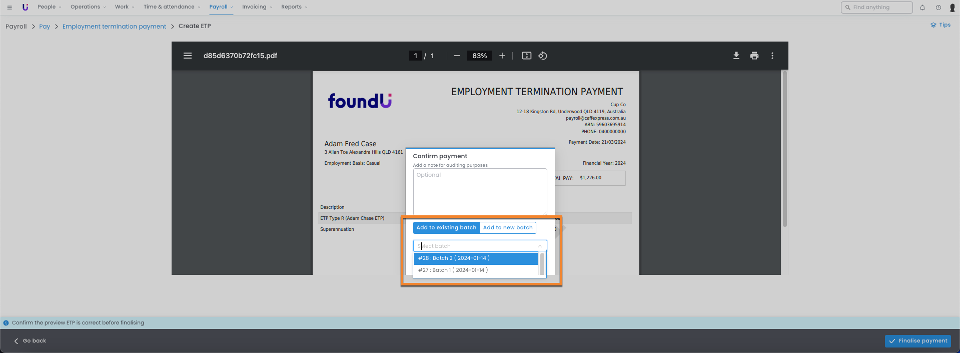 - Complete the ETP workflow, on the final step select Finalise Payment to open the batching modal.
