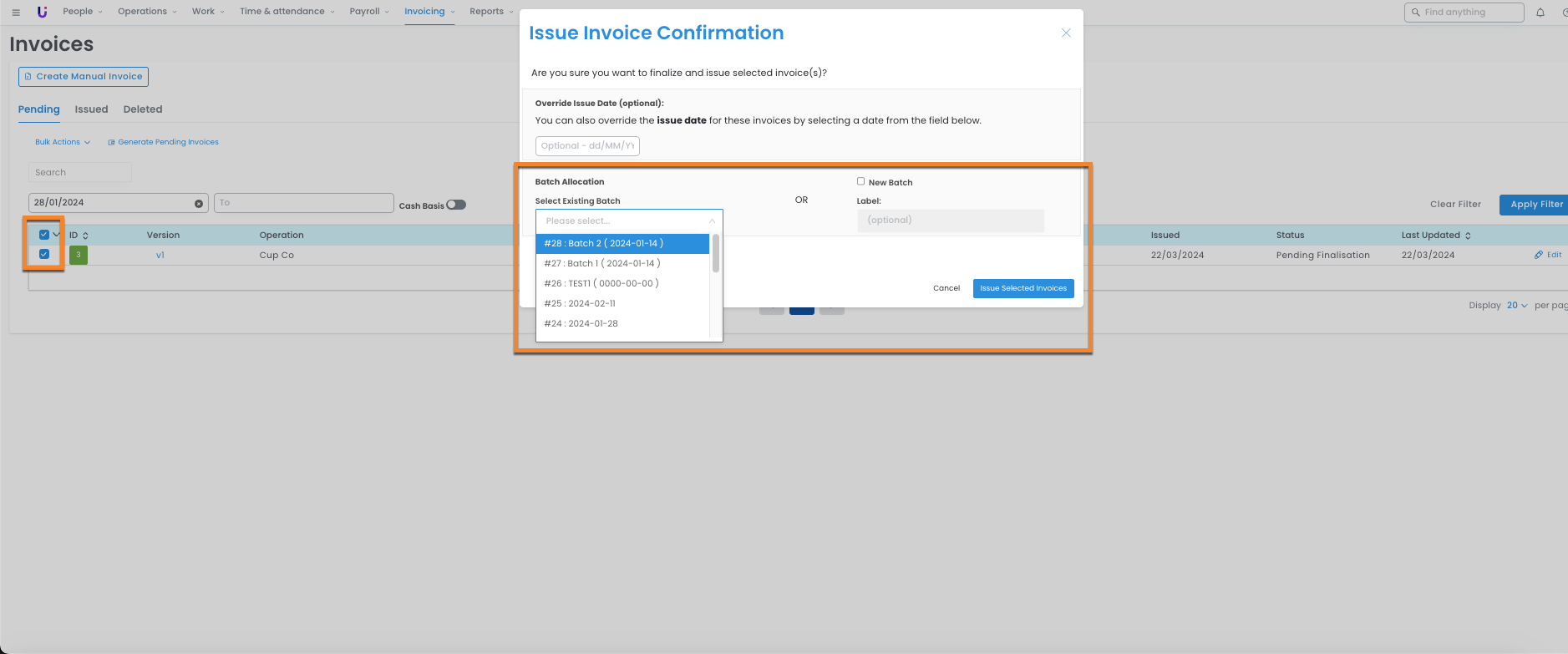 - Once generated, select your required invoices and issue, to open the batching modal.