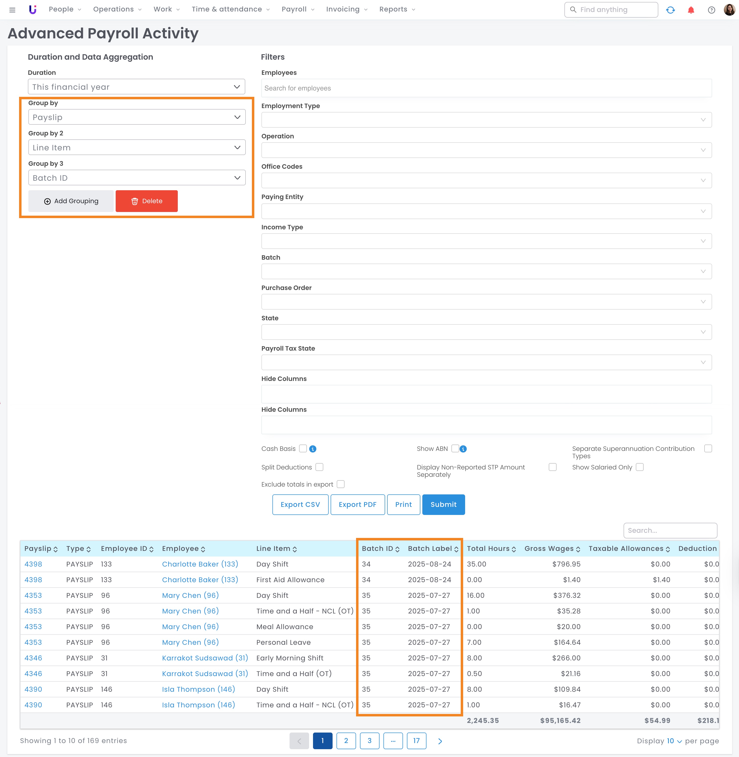 Batching - group employee payments, ETPs, and invoices for financial reporting.