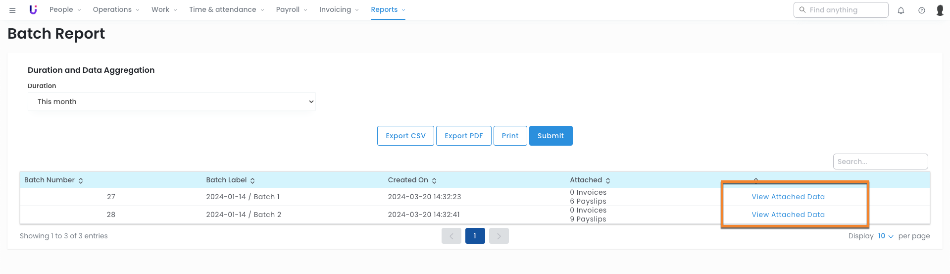 - Once generated select the View Attached Data link to navigate to the linked payslip and invoices.
