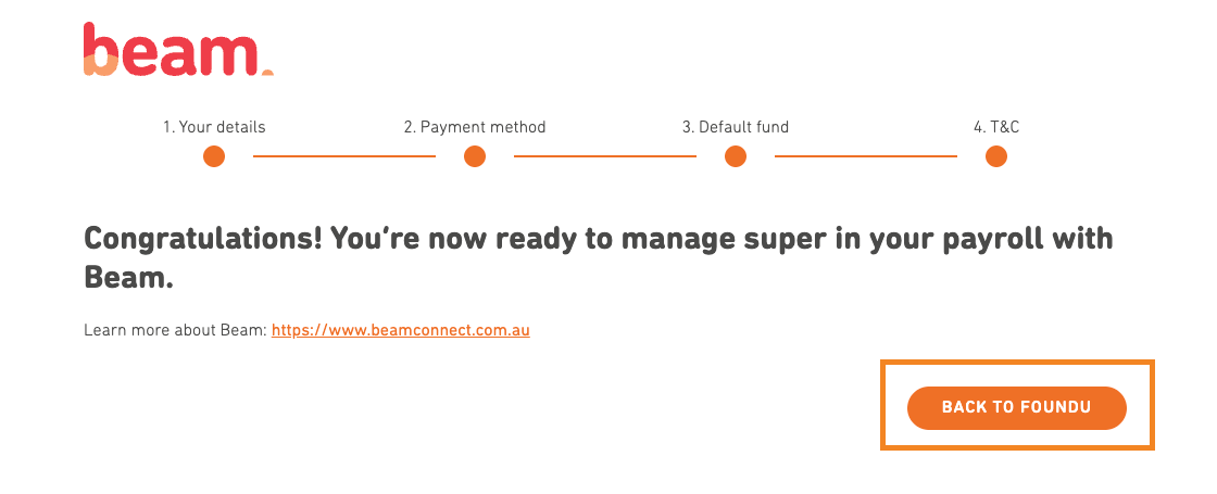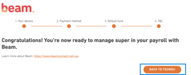 You'll then see a final Beam confirmation screen: "Congratulations! You're now ready to manage super in your payroll with Beam." You'll then need to select the back to foundU button to save and complete the registration. This will then return you to your foundU settings.