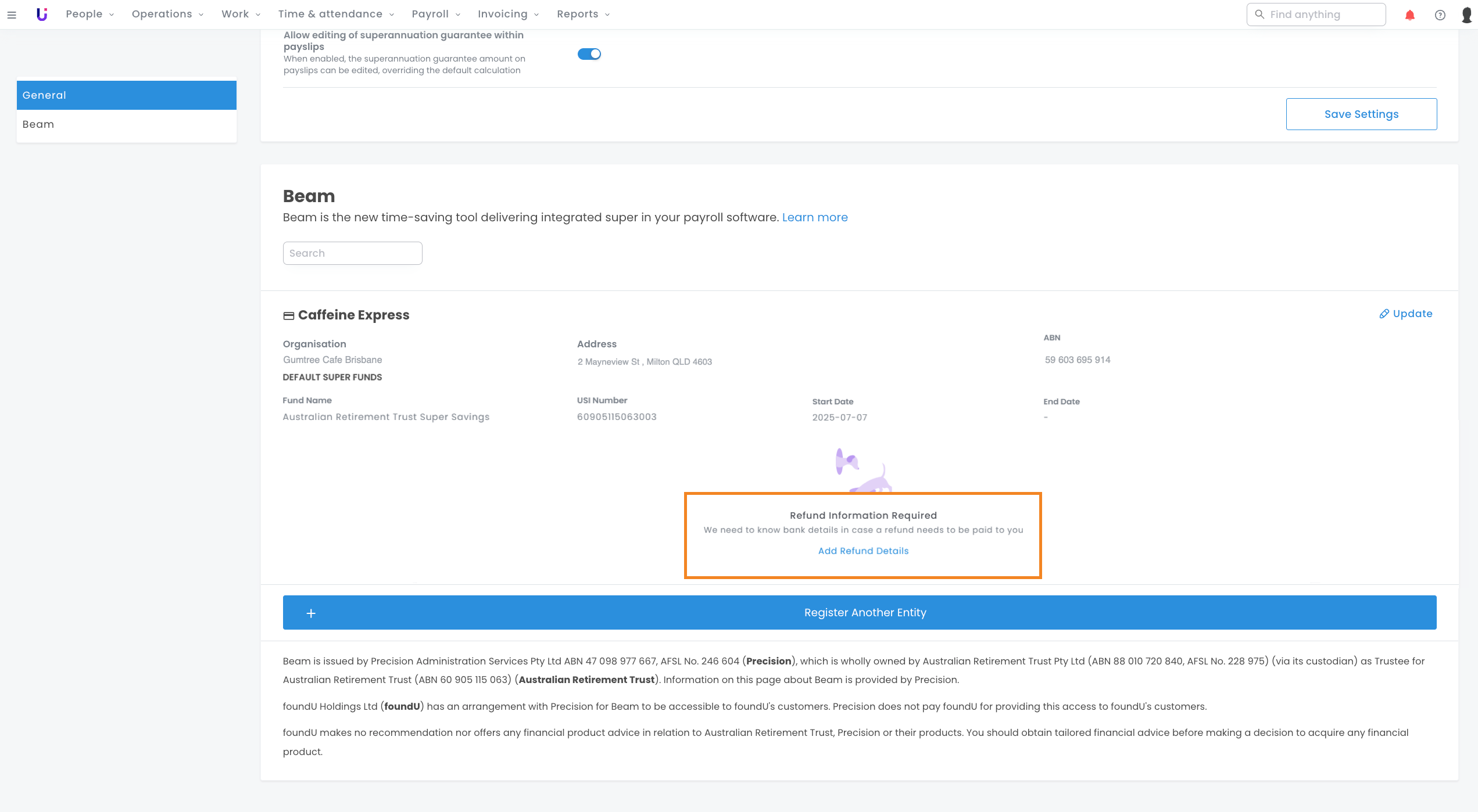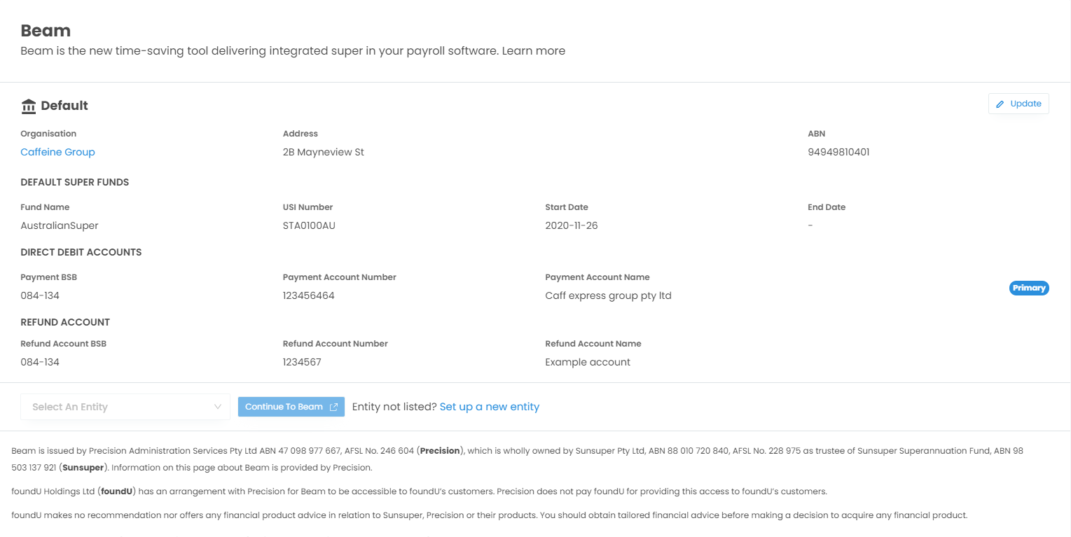 Once you've registered for Beam and chosen your General Superannuation preferences, you can then specify the details of your Paying entity and default super funds will be listed in the Beam menu.