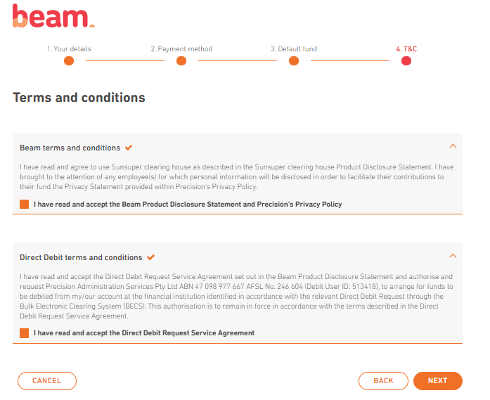 - This will take you to the Beam registration page where you will set up your details, payment method, default fund and terms & conditions.