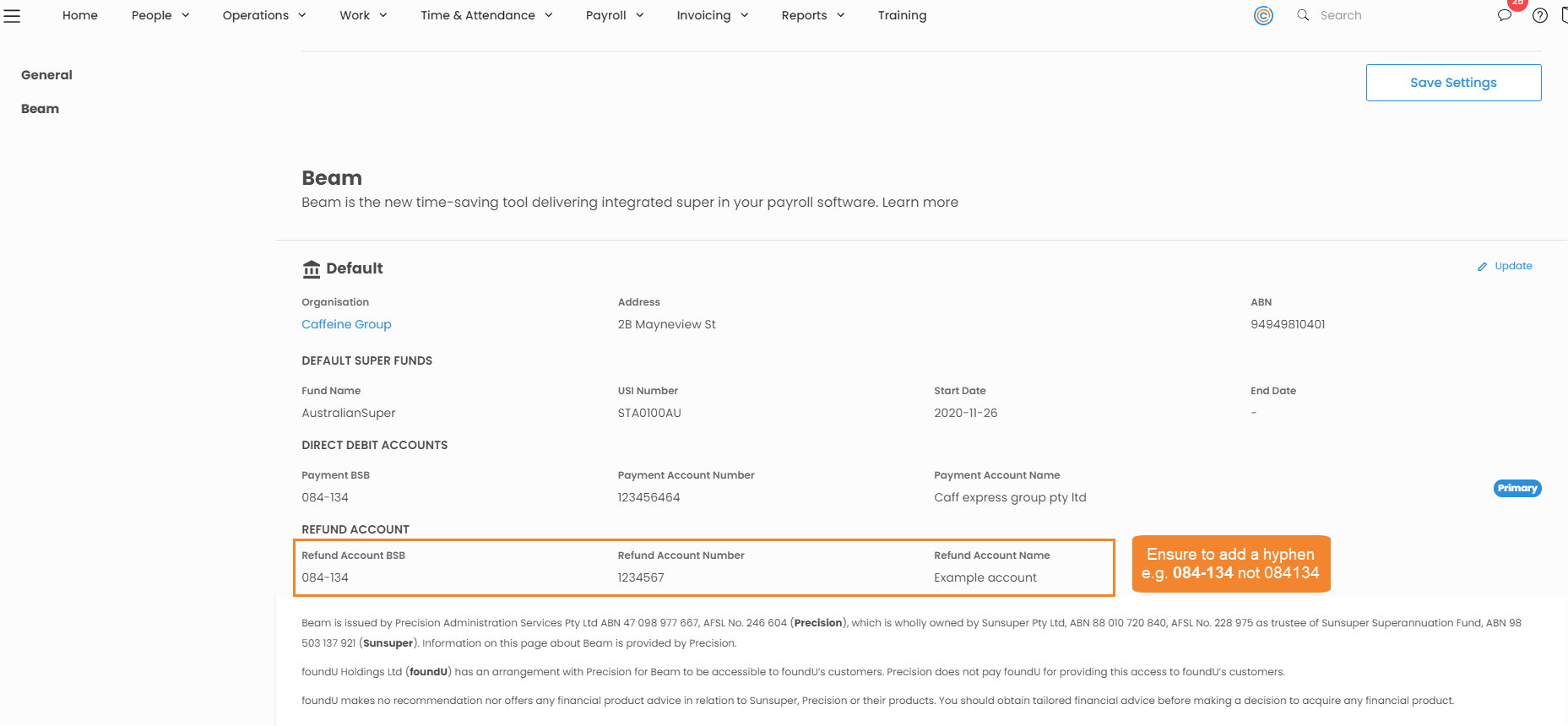Once set up, details can be updated at anytime through the Beam setup and configuration process found in Payroll Settings > Superannuation.