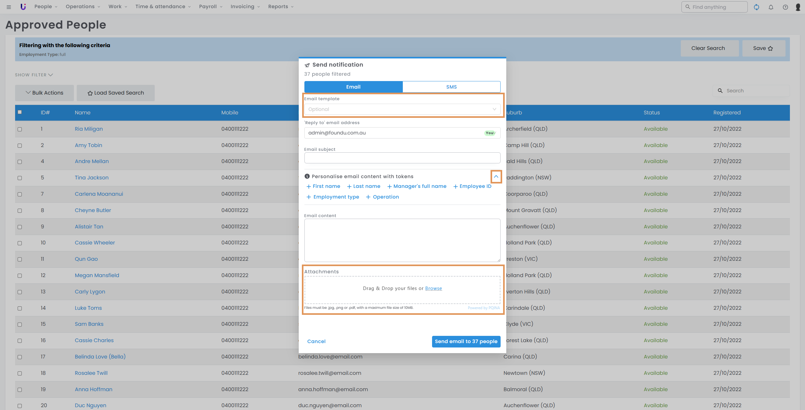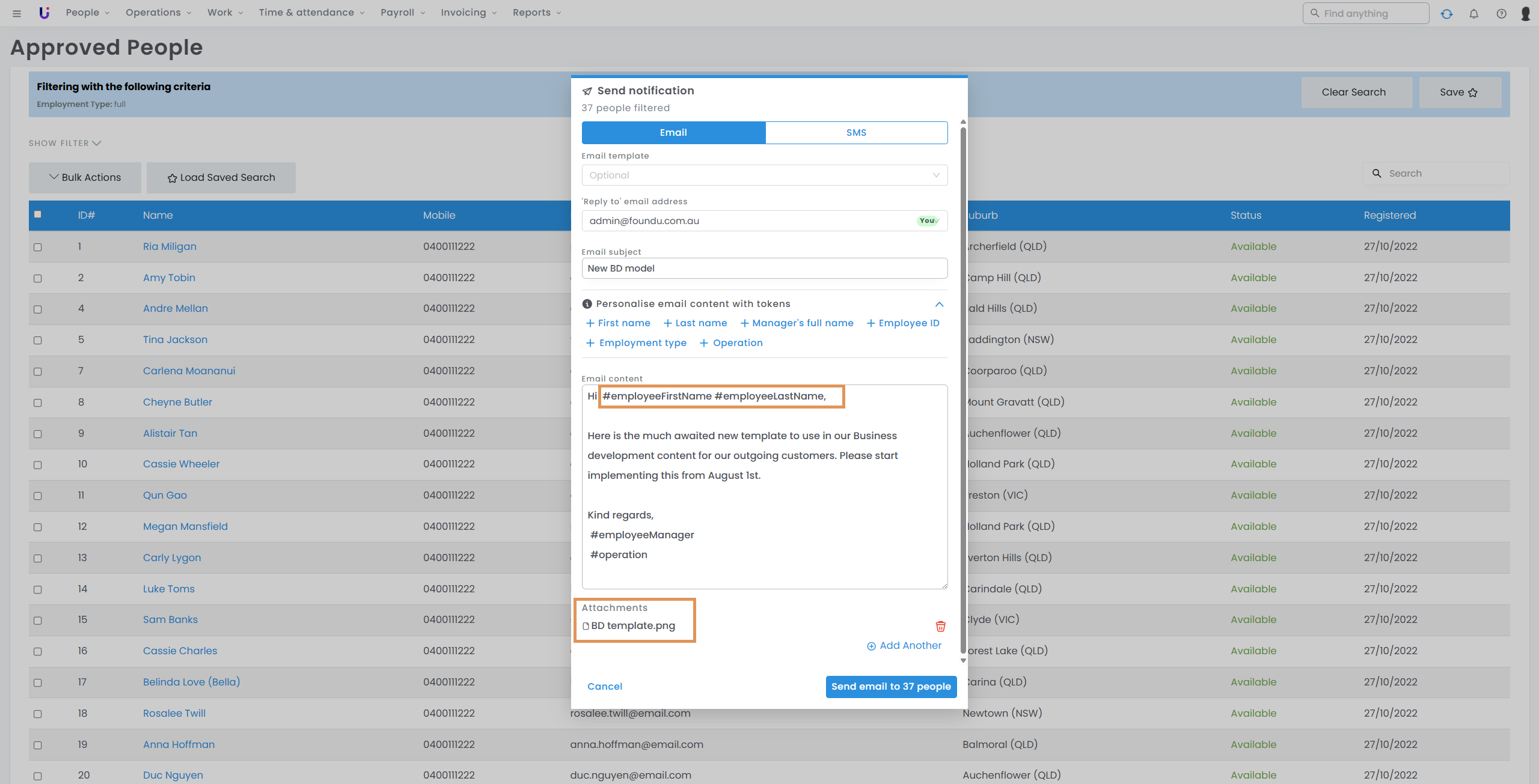 Below you can see the use of the first name, last name, employee manager tokens, and the attachments added. You can also see that the email will be sent to 37 employees based on your filtered group.